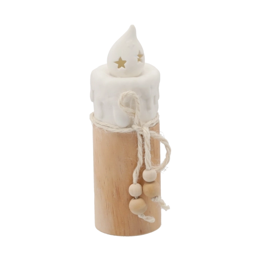 En stilfuld juledekoration i form af et keramisk lys med LED-belysning, der lyser op i enhver indretning. De kompakte mål 7 × 7 × 19 cm og det elegante keramiske design passer til både bord, vindueskarm og hylde. LR44-batterier medfølger, så dekorationen kan tages i brug med det samme.
