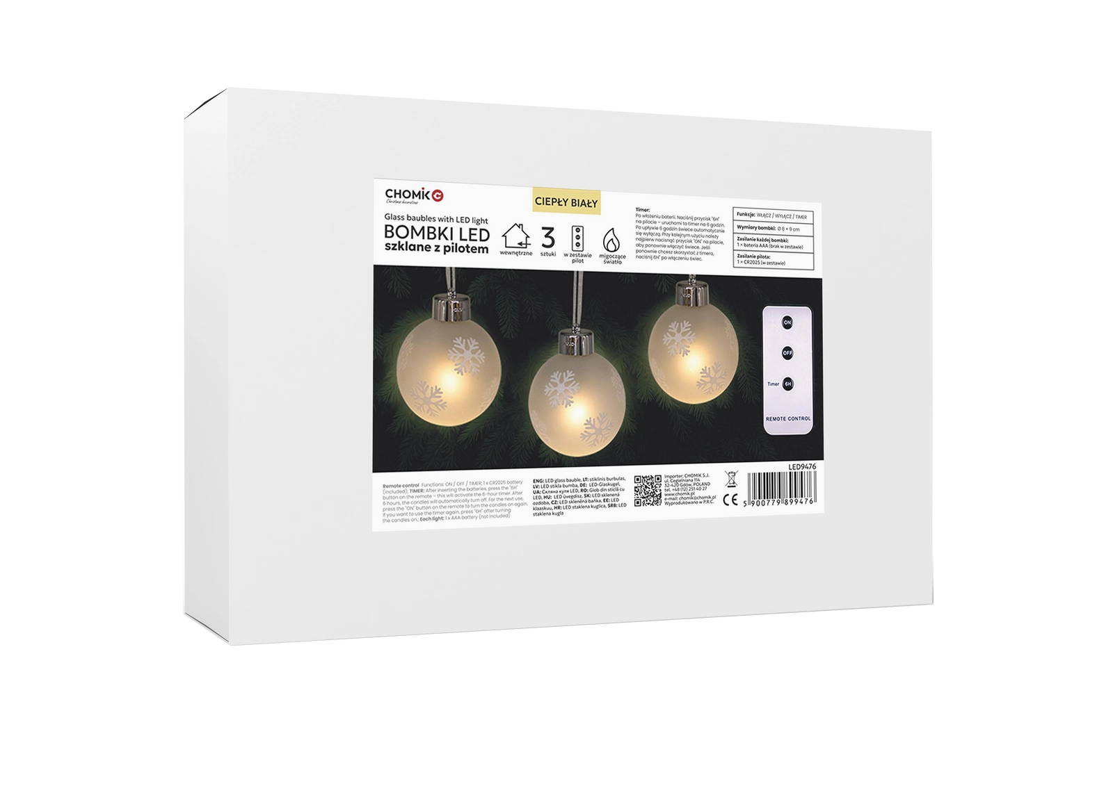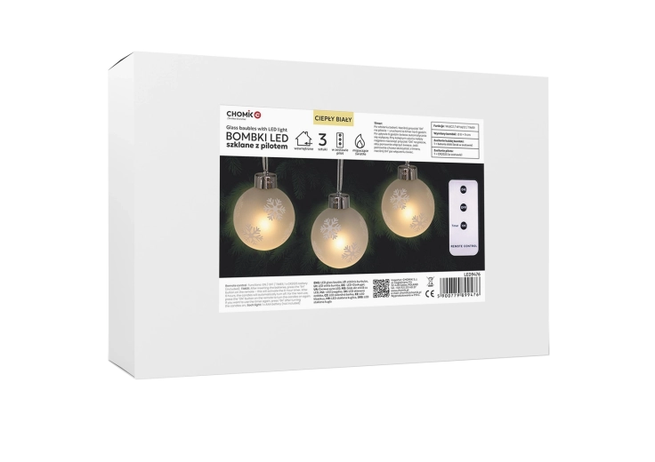 Skab en magisk, festlig stemning derhjemme med et sæt på tre glaskugler med et fint snefnugmønster og varmt LED-lys. Takket være fjernbetjening med timer og batteridrift er dekorationen nem at betjene, sikker og klar til brug med det samme hvor som helst – på træet, hylden eller bordet.