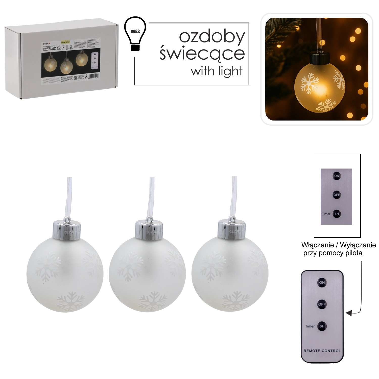 Sæt med 3 glaskugler med LED, snefnug og fjernbetjening 8 × 10 cm