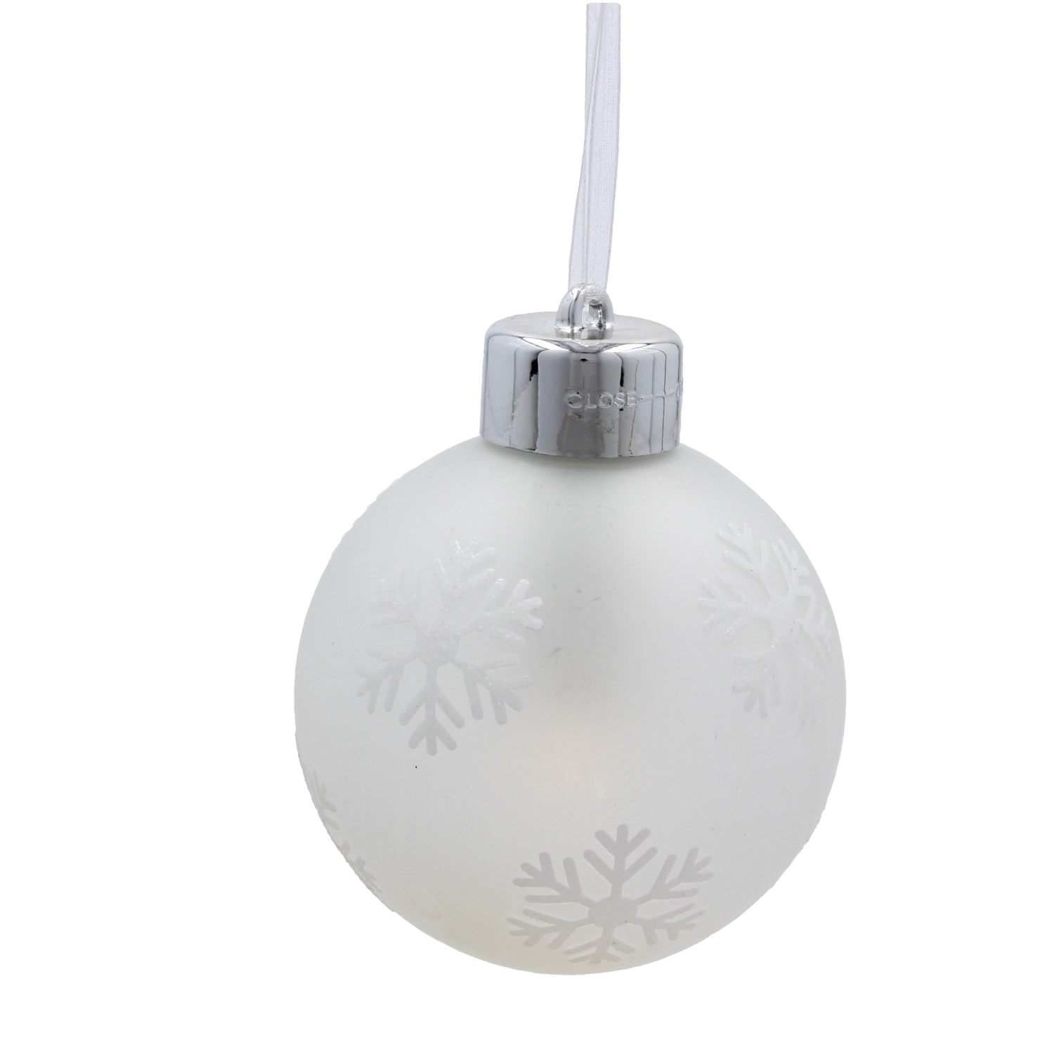 Elegante glaskugler med mat overflade og snefnug lyser dit juletræ og interiør op med et behageligt, varmt lys. De indbyggede LED-dioder skaber en hyggelig glød med let glimmer, som fuldender julepynten uden besvær med kabler.