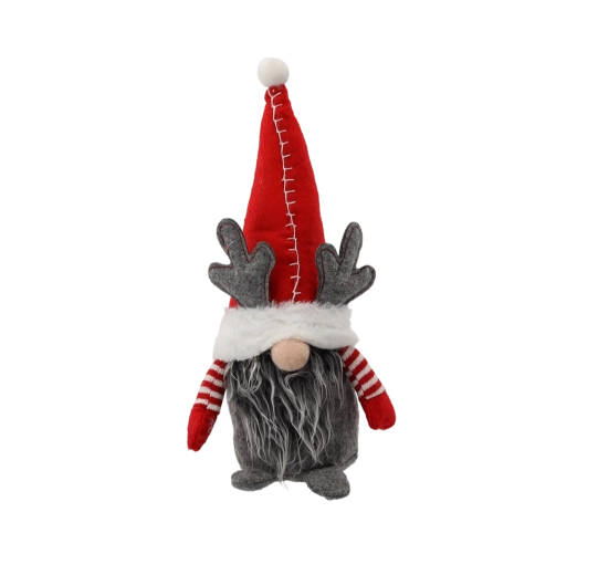 Sød julenisse på 30 cm i blød udførelse med rød hue og grå rensdyrgevir, som giver dit hjem en magisk julestemning. Perfekt til kommode, hylde og bord – kompakt dekoration, der gør interiøret hyggeligt med det samme og tilfører et legende, festligt præg.