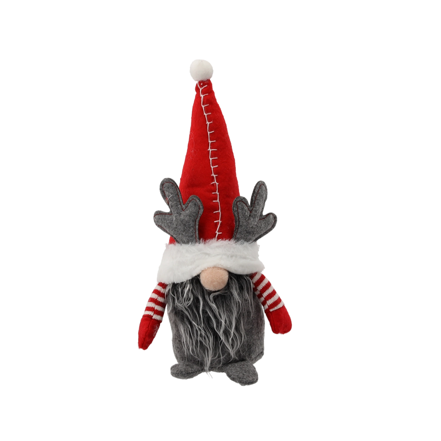 Grå gevirer og en høj hue med hvid kant giver din pynt et unikt og muntert udtryk.