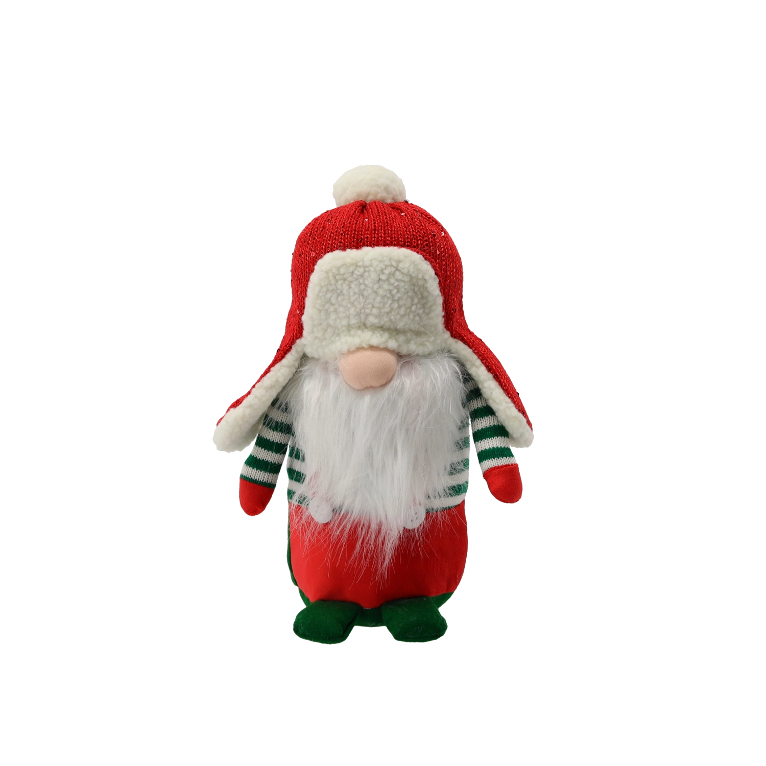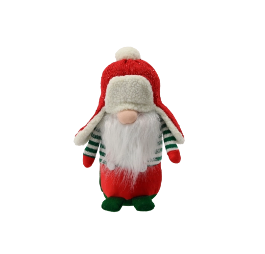 Denne dekorative nisse med langt hvidt fuldskæg, rød vinterhue med øreklapper og stribede ærmer er designet til at sidde stabilt og give rummet et varmt præg. Den er et oplagt supplement til den festlige udsmykning i stue, entré og børneværelse.