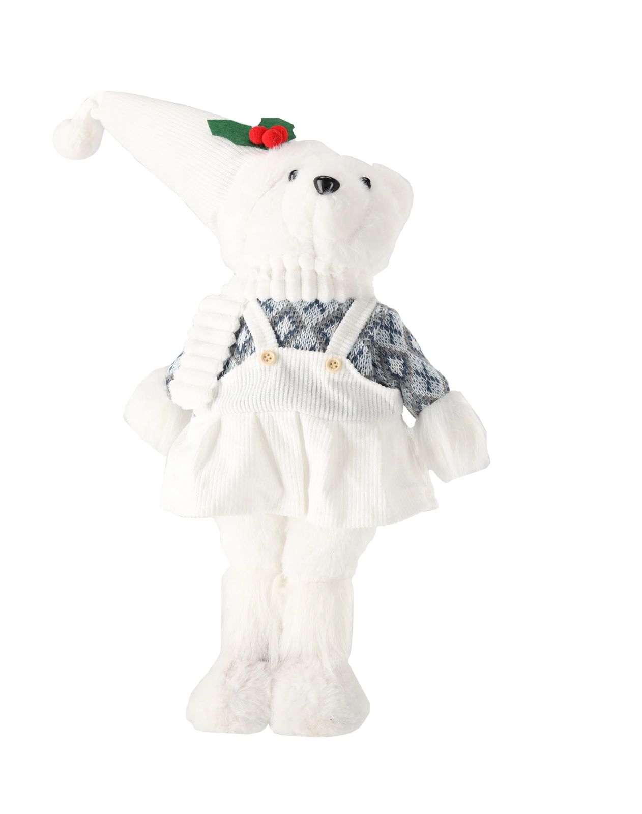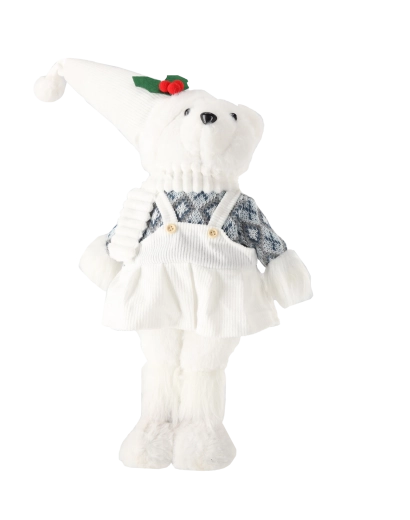 Denne charmerende bamse imponerer med sit bløde look, vintertøj og hængende ben, som får den til at tage sig flot ud på en hylde eller kamin. Med en højde på 50 cm bliver den et iøjnefaldende element i din pynt og glæder både børn og voksne.