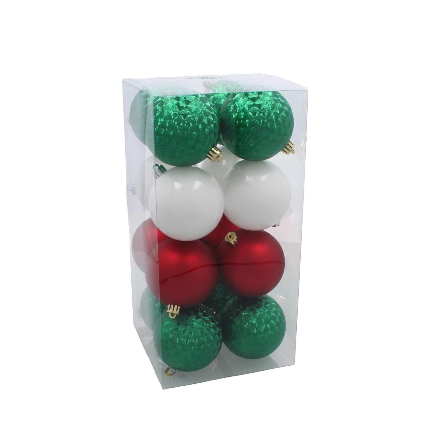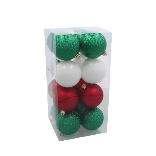 Stilfuldt sæt med 16 julekugler med en diameter på 8 cm i rød, grøn og hvid, som giver træet et traditionelt og elegant udtryk. Kombinationen af matte og blanke overflader skaber en smuk glans i lyset. Det holdbare plastmateriale er sikkert for børn og kæledyr og sikrer lang levetid. Der medfølger en praktisk emballage til nem opbevaring.