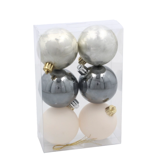 Hver kugle er udstyret med en dekorativ snor for nem ophængning på træ, krans eller guirlande. De forskellige overflader – blank, mat og glimmer giver arrangementet dybde, kontrast og festlig glans. Den praktiske emballage i rør gør opbevaring og beskyttelse af pynt efter jul nemmere.