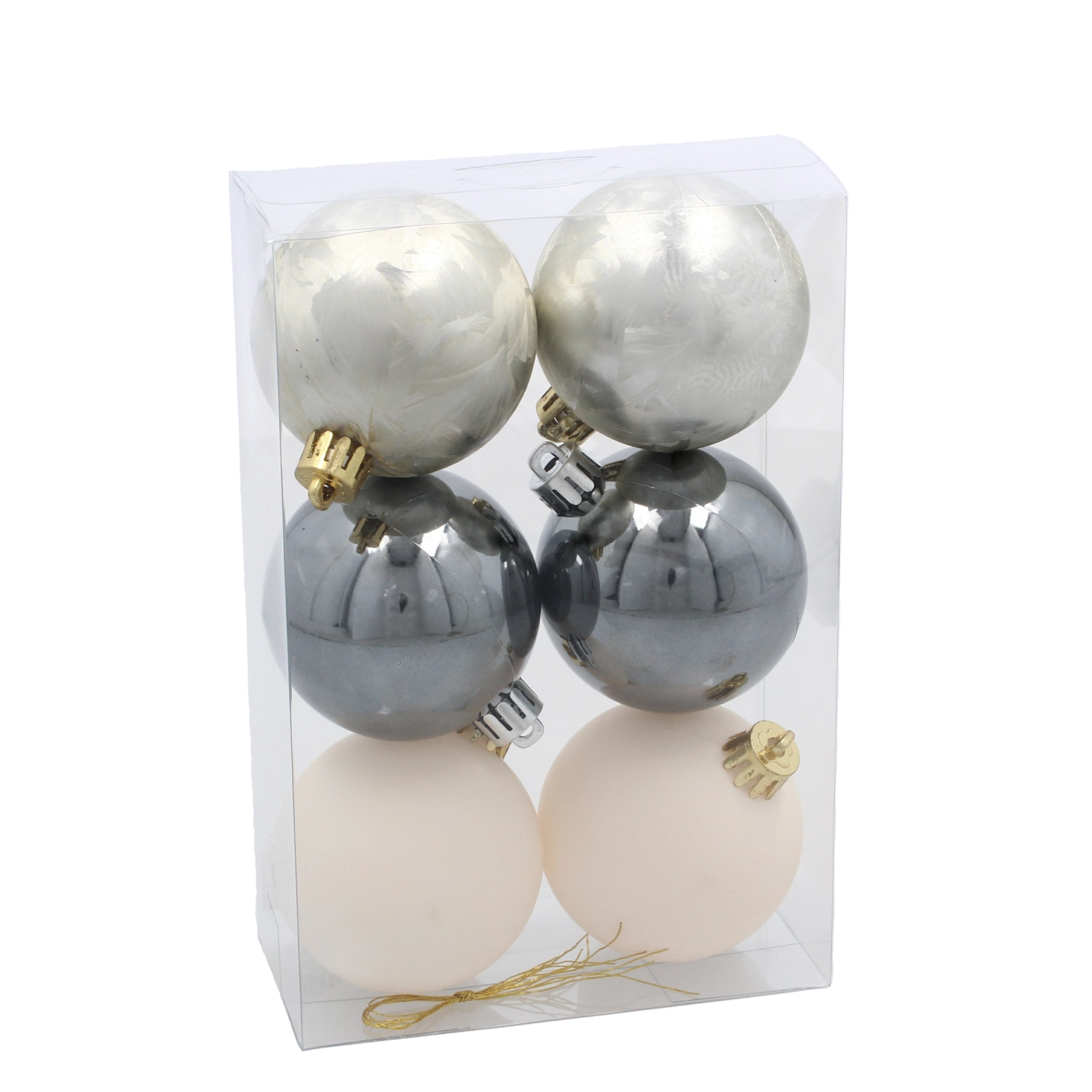 Dette designsæt af julekugler i diskrete toner af champagne, grå og hvid bringer en afbalanceret æstetik, som passer til både traditionelle og moderne dekorationer. Takket være splintsikker plast får du glassets skønhed uden bekymring for brud og med lang levetid gennem mange sæsoner.