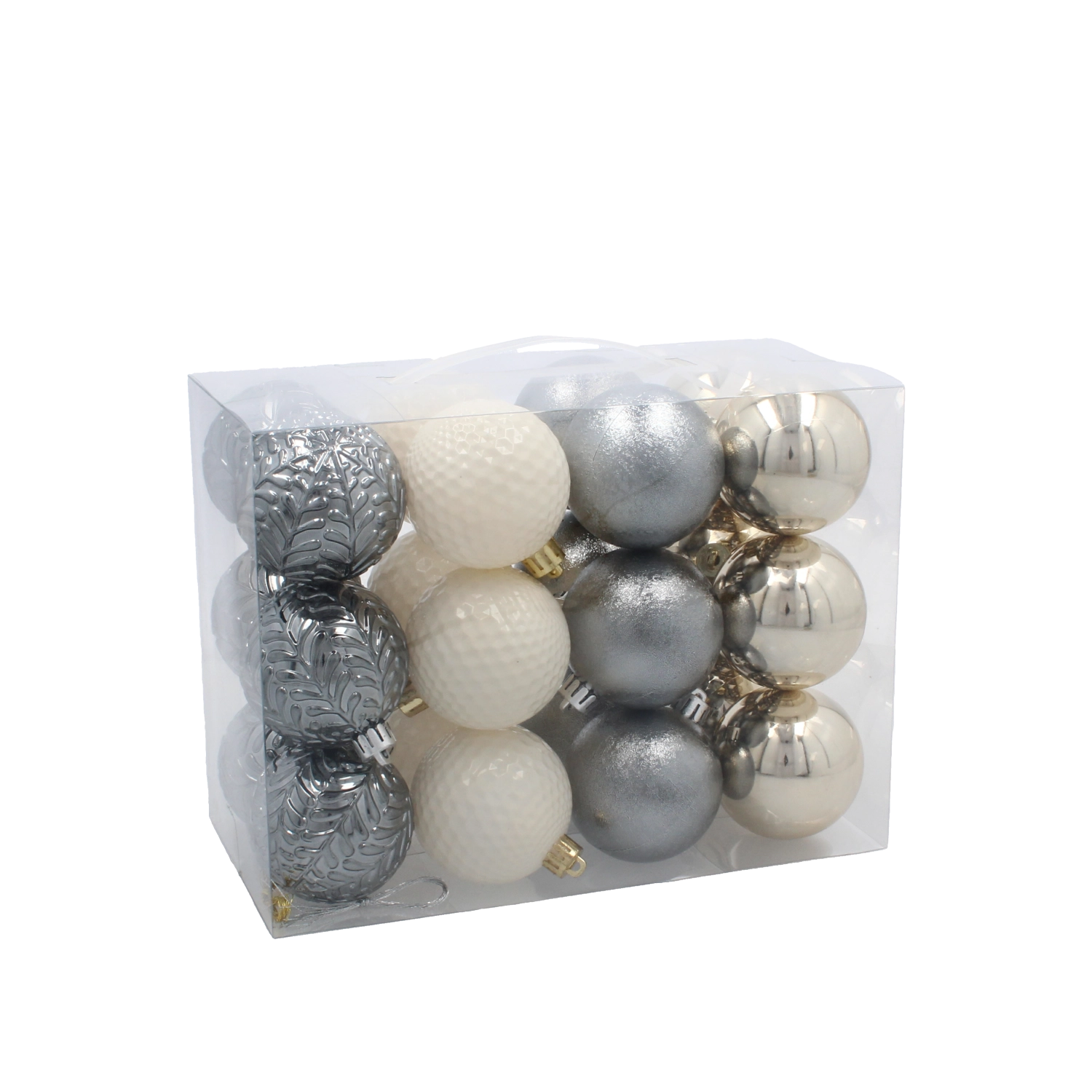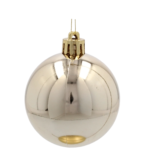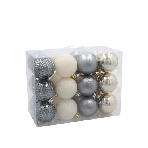 Elegant sæt med 24 julekugler i diameter 6 cm i nuancerne champagne, grå og hvid, som oplyser dit træ og din indretning. Pynten er fremstillet af let og holdbar plast, hvilket gør den sikker og langtidsholdbar. Den kombinerer blanke, matte og glitrende overflader og skaber en sofistikeret og harmonisk dekoration. Den praktiske plastemballage gør det let at opbevare uden for sæsonen.