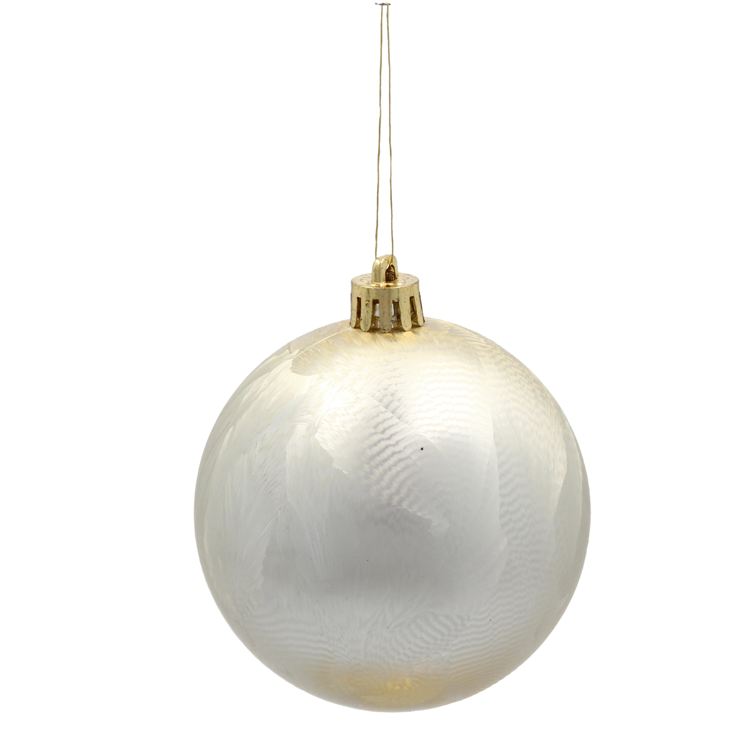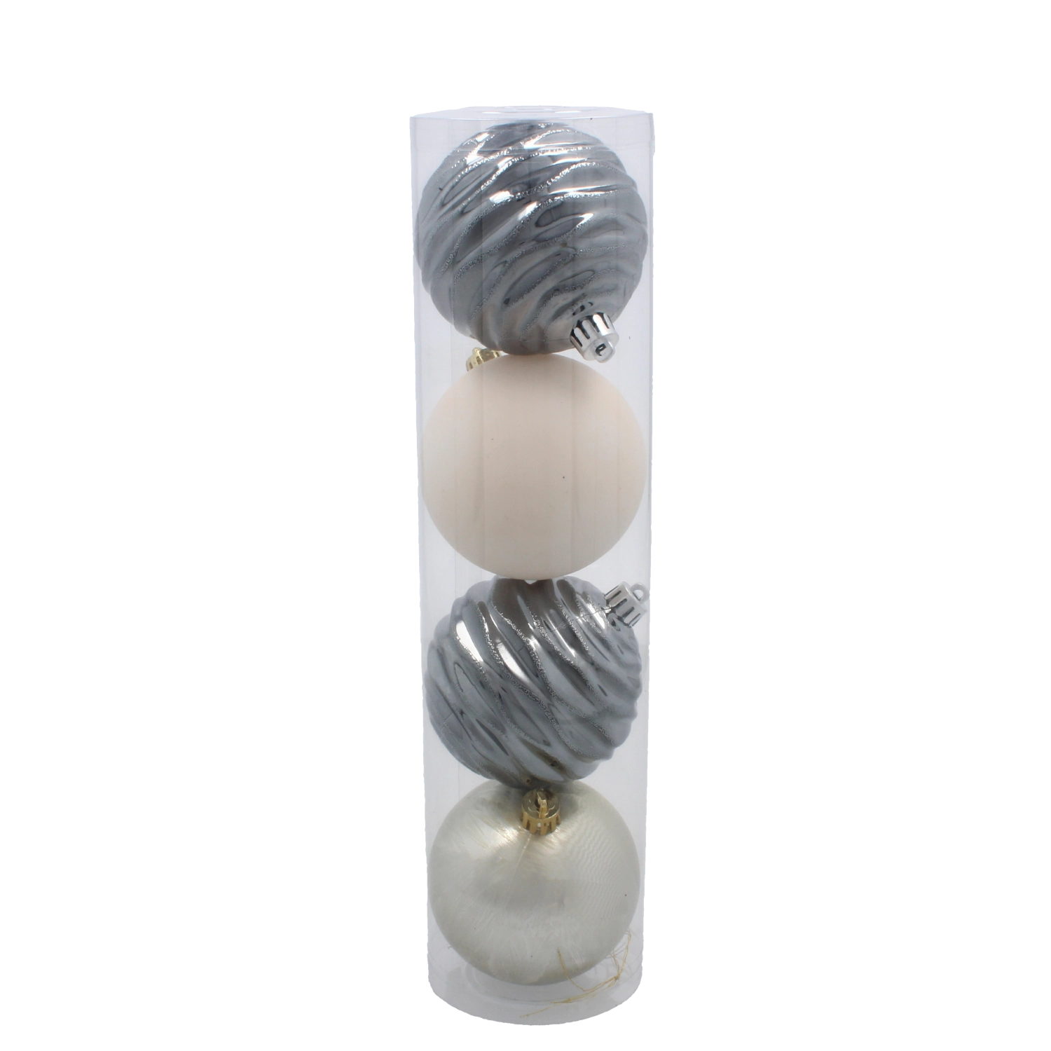 Elegant sæt med fire julekugler med en diameter på 8 cm i nuancerne champagne, grå og hvid, som giver udsmykningen et sofistikeret udtryk og harmoni. Holdbar plast sikrer sikker håndtering og lang levetid, og mixet af matte, blanke og glitrende overflader skaber en effektfuld kontrast. Den praktiske gennemsigtige tube er velegnet til opbevaring, udstilling og nem gavegivning.