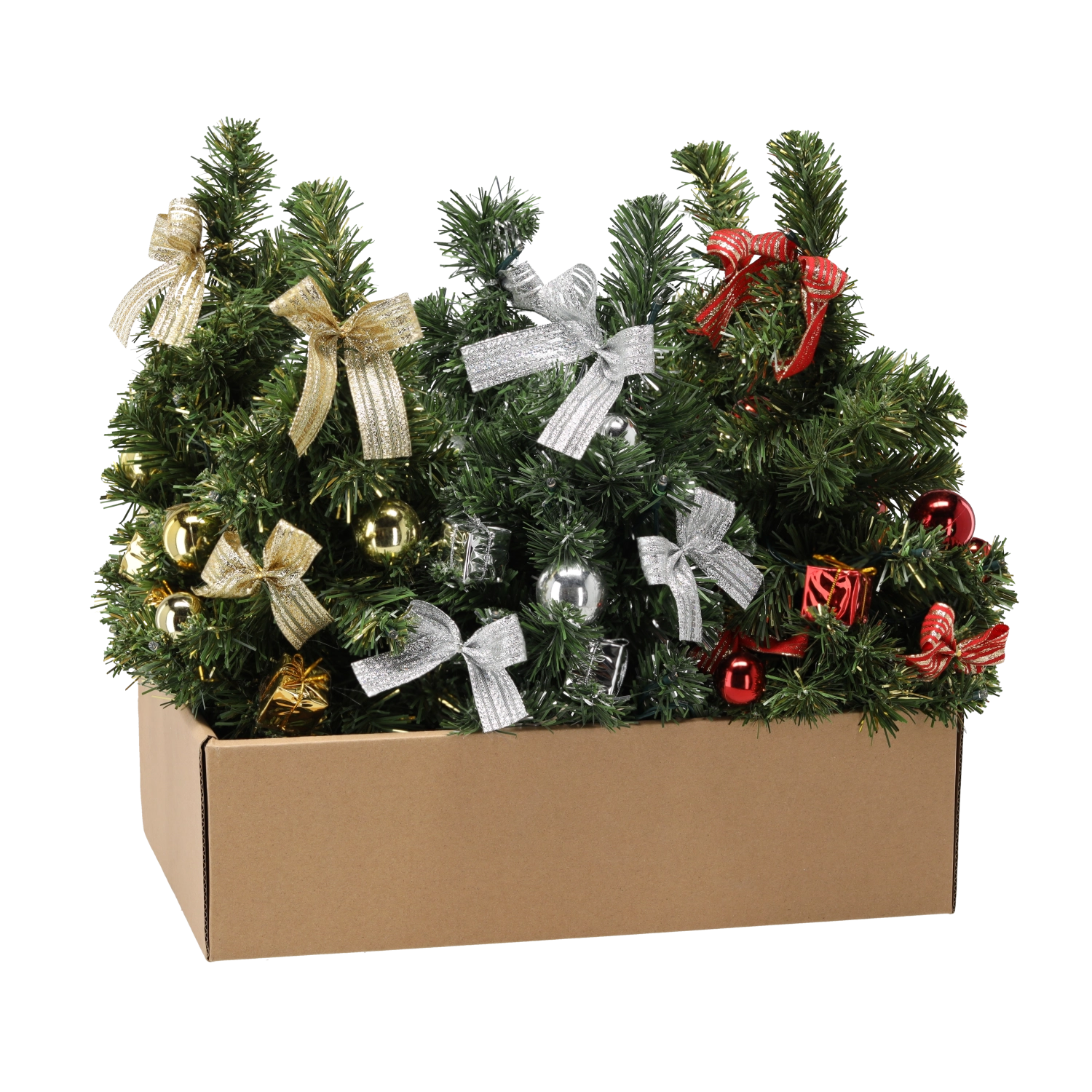 Træet er pyntet med sløjfer og kugler i røde, sølv- eller gyldne nuancer – det er bare at pakke ud og stille frem.