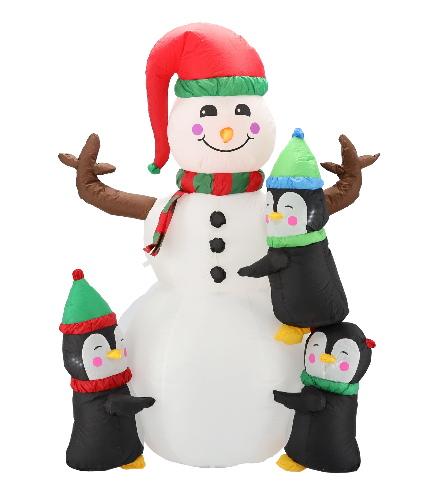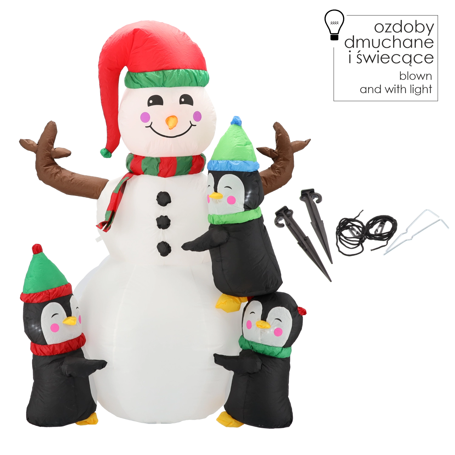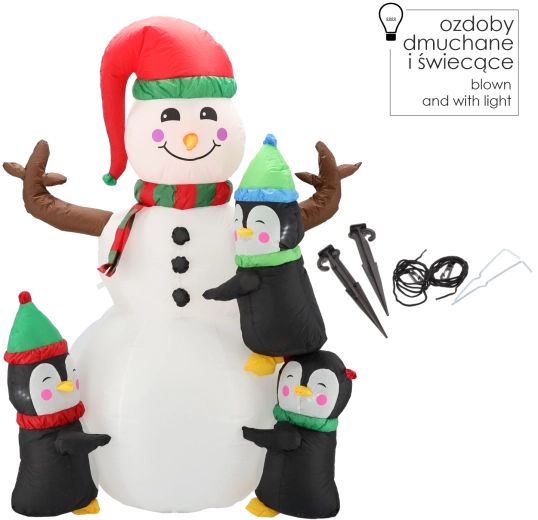 LED-belysning (3× hvid + 2× farvet) sikrer en effektfuld glød og perfekt synlighed efter mørkets frembrud, mens IP44-klassificeringen og kvalitetsmaterialer er klar til vintervejr. Sæt blot i stikkontakten, og på et øjeblik er dekorationen oppustet og klar til at sprede glæde.