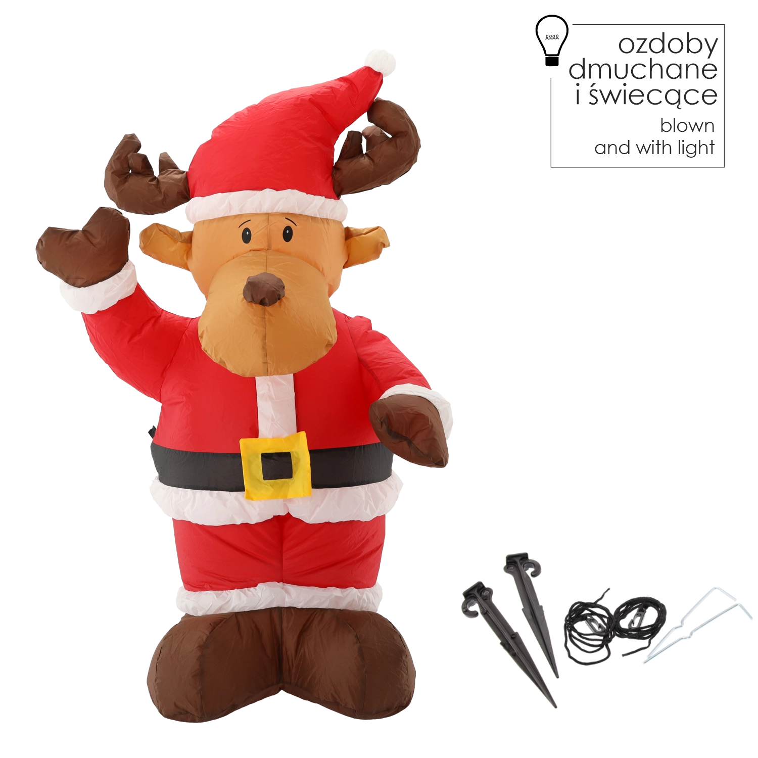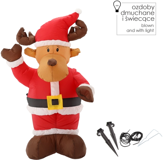 Dette oppustelige rensdyr er den perfekte juledekoration til forhaver, terrasser og indendørs brug. Det glade design i rød-hvid nissedragt skaber straks en festlig atmosfære, og det indbyggede LED-lys giver en flot effekt efter mørkets frembrud.