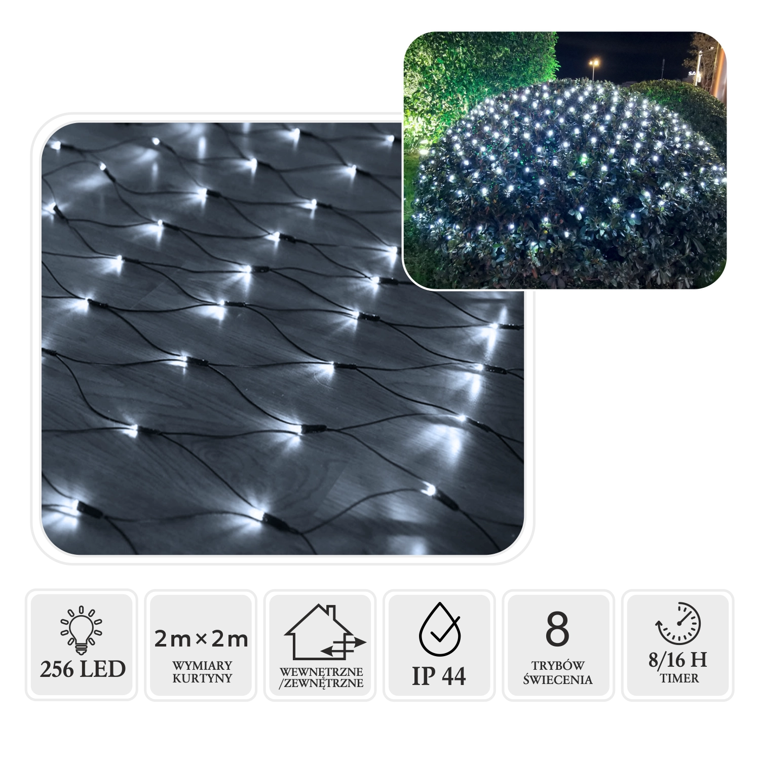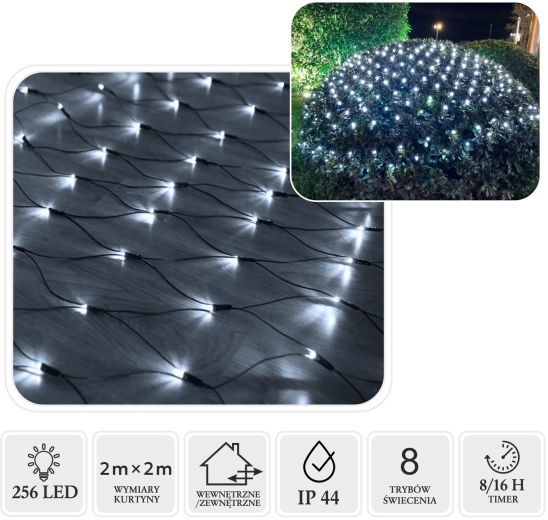 Skab en magisk vinterstemning med et lysnet på 2 × 2 m med 256 koldt hvide LED'er. Takket være IP44-beskyttelse er det velegnet til både indendørs og udendørs brug, tilbyder 8 lysfunktioner, hukommelse for indstillinger og en praktisk timer 8/16 t for bekymringsfri drift.
