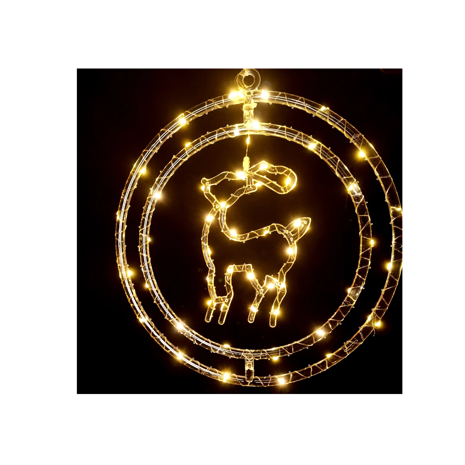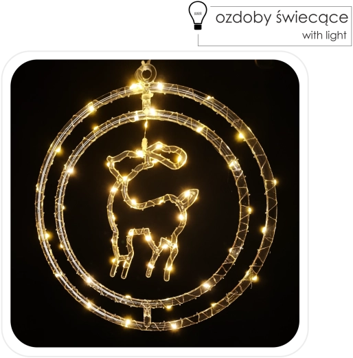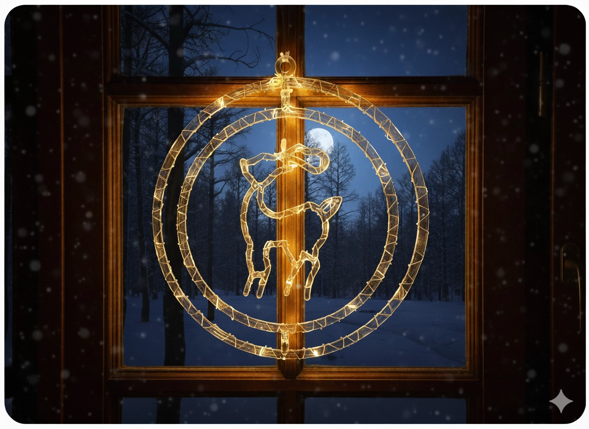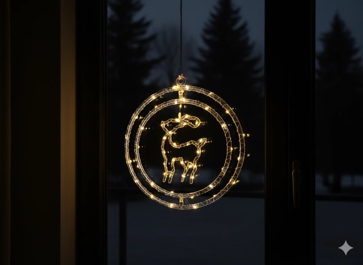 Bring julens magi ind i hjemmet med en elegant vinduesdekoration formet som et rensdyr i en ring. 50 fine mikro-LED lyser i varm hvid og skaber en hyggelig atmosfære. Takket være AA-batteridrift kan du placere den hvor som helst uden kabler, og den transparente ledning giver et rent og diskret udtryk – ideel i vinduet, på en hylde eller vindueskarmen.