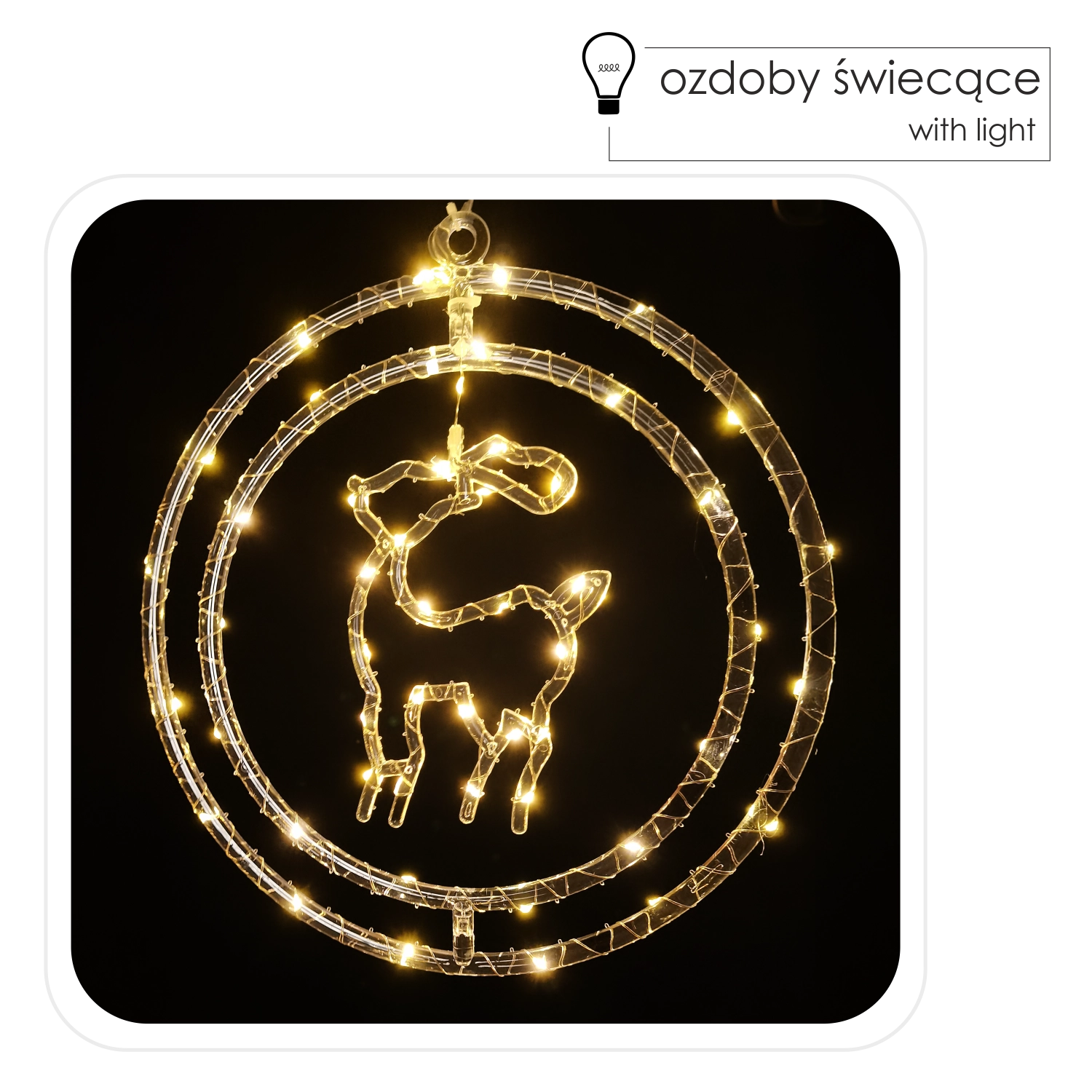 En stilfuld juledekoration med rensdyr i ring, der lyser dine aftener op med et behageligt, varmt hvidt lys. Med 50 mikro-LED virker den både diskret og effektfuld, mens batteridrift 3× AA giver frihed til placering uden behov for stikkontakt.