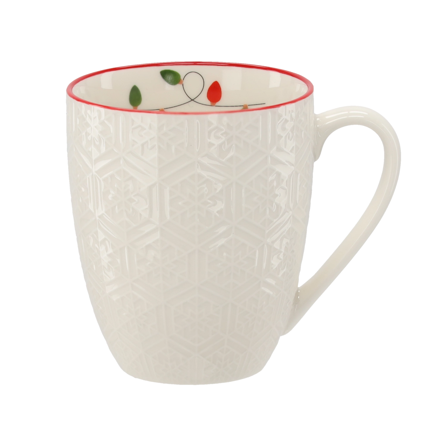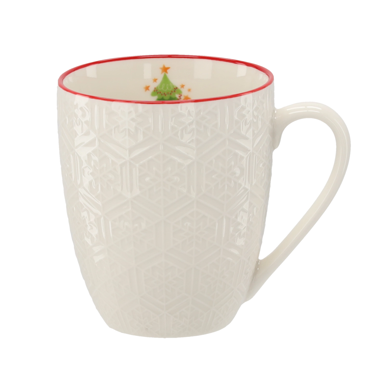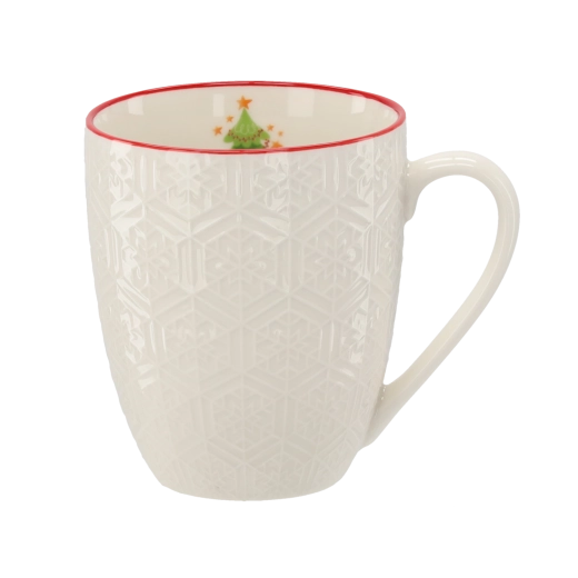 Den fine geometriske relief kombineret med den røde kant giver kruset et unikt udseende, der understreger julehyggen ved ethvert bord.
