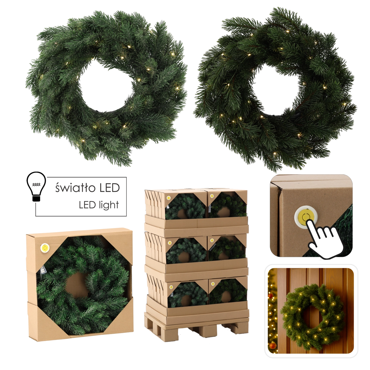 Praktisk Try Me-knap til hurtig afprøvning og batteridrift 3× AA gør det muligt at placere kransen hvor som helst uden kabler.