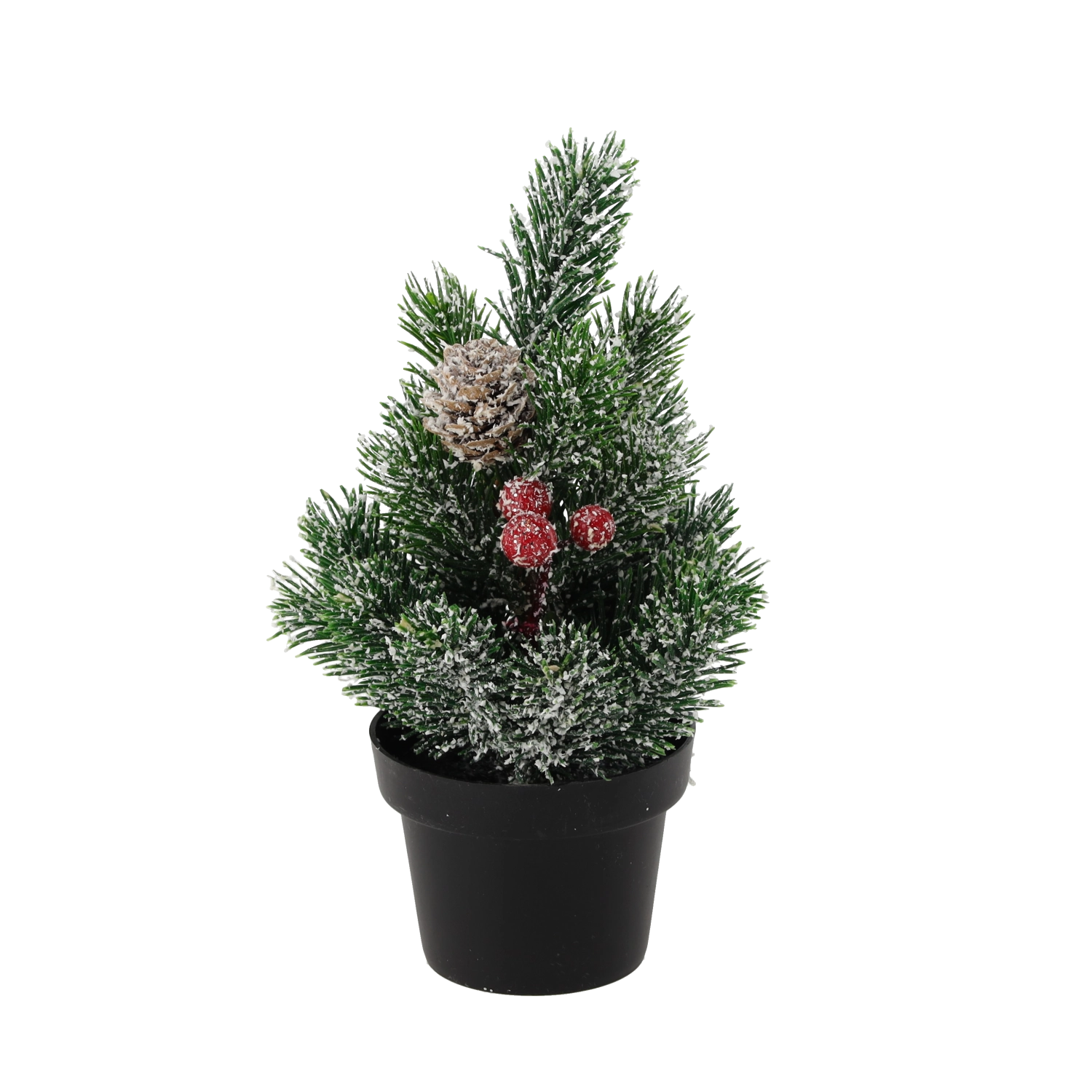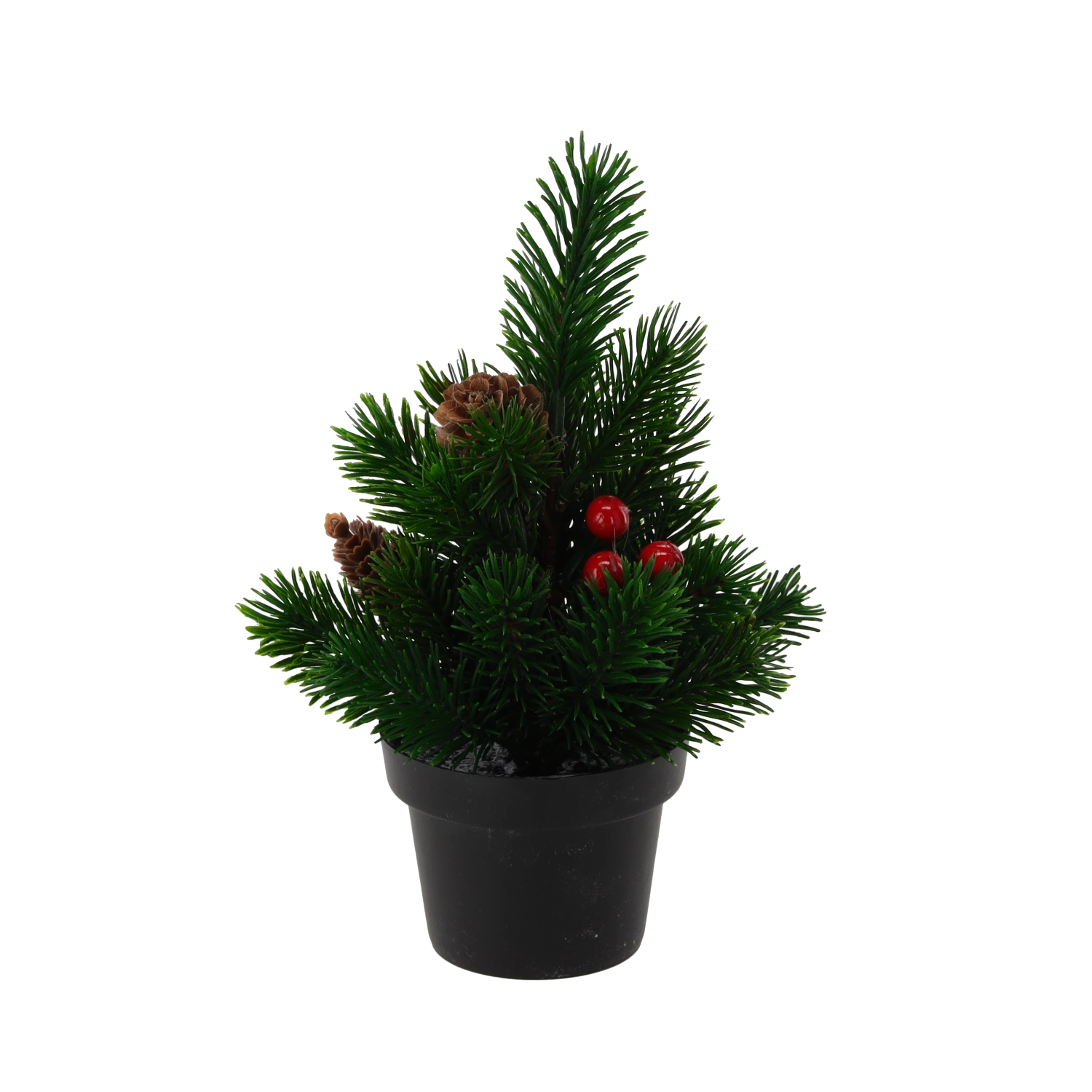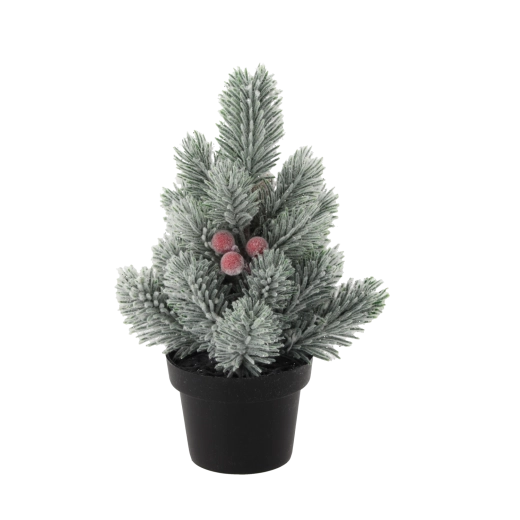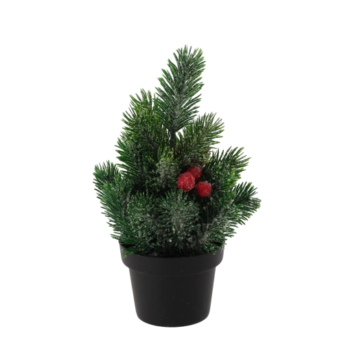 Gør dit hjem hyggeligt i højtiden med dette mini juletræ i potte, 21 cm højt. Takket være den kompakte størrelse er det ideelt til bord, hylde eller reception, har realistiske nåle, dekorative røde bær og kogler og er klar til øjeblikkelig udstilling uden vedligeholdelse.