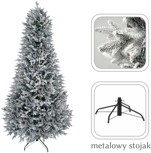 Træet samles nemt og hurtigt, er robust, kræver minimal vedligeholdelse, og takket være det kvalitetsrige materiale bevarer det form og farve i mange sæsoner. De grønne nåle med hvid “sne” skaber en realistisk effekt af et ægte vintertræ.