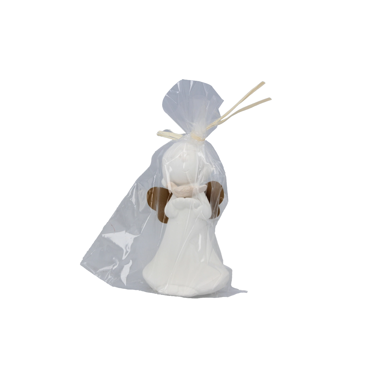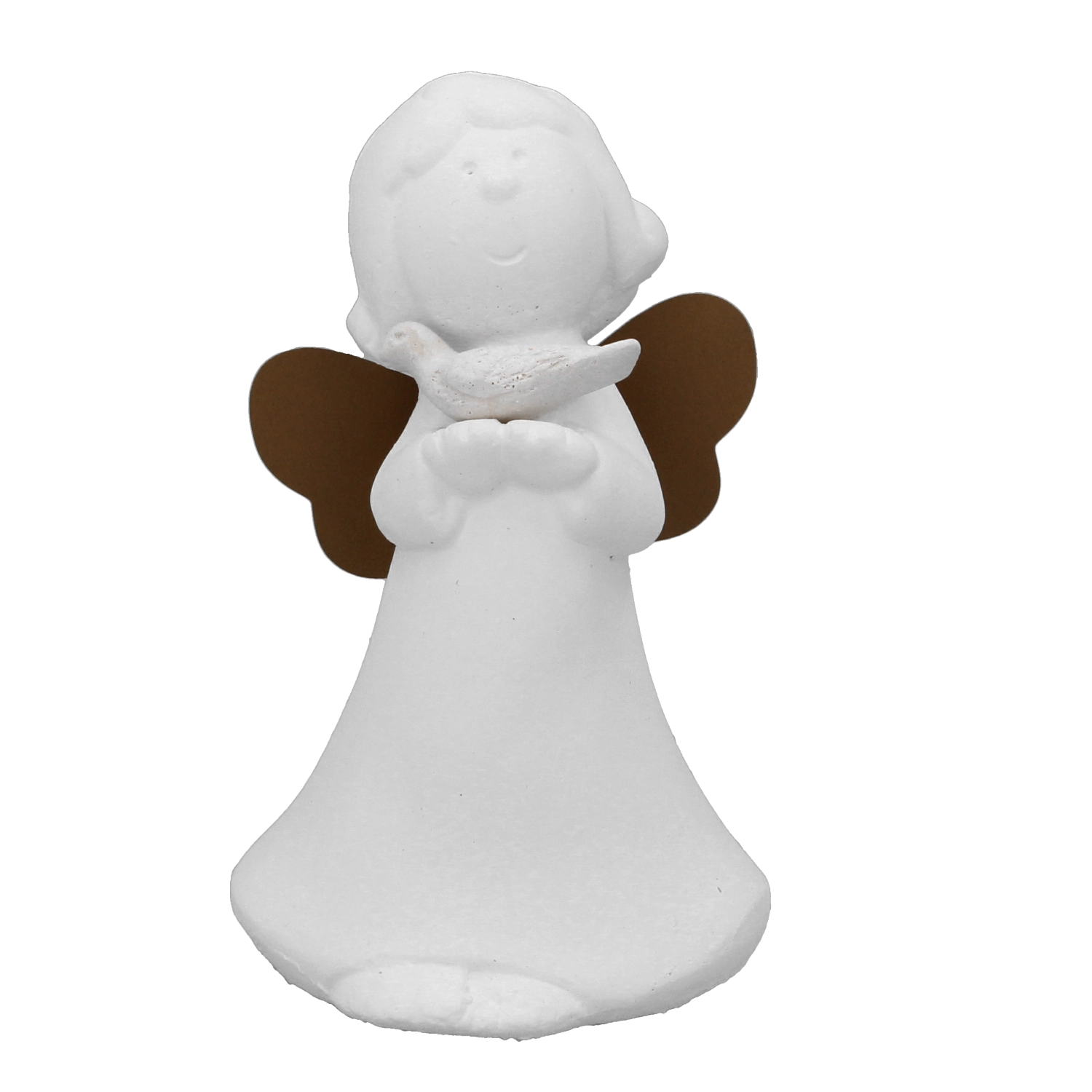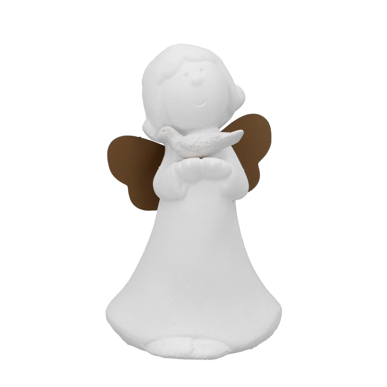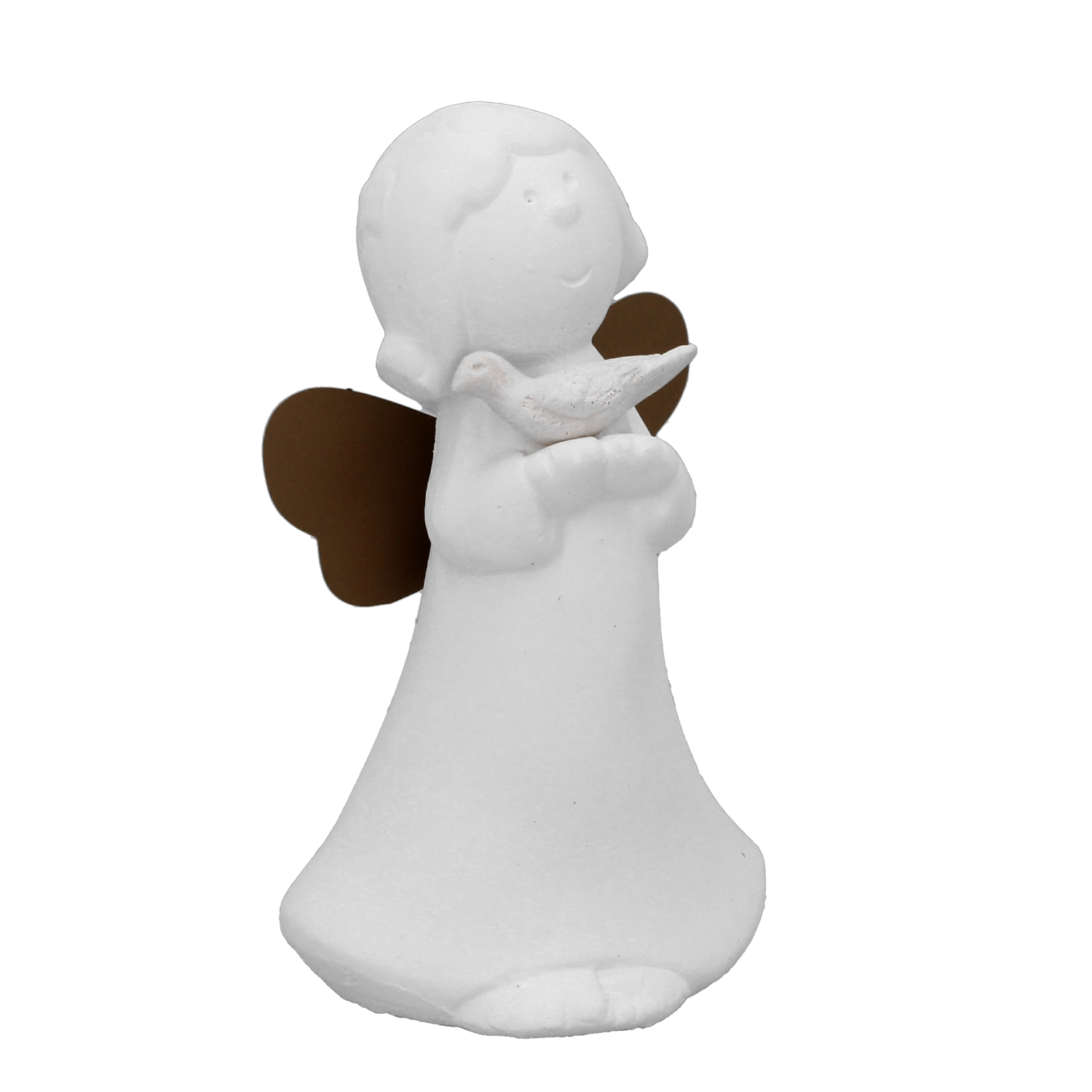 Denne diskrete englefigur med en due symboliserer ro, håb og beskyttelse. Det minimalistiske design i hvid og den glatte, matte overflade gør den til et tidløst tilbehør, der let kan matches med både moderne og klassisk boligstil. Med en kompakt højde på 11 cm kan den placeres på en hylde, et skrivebord, en vindueskarm eller på det festlige bord.