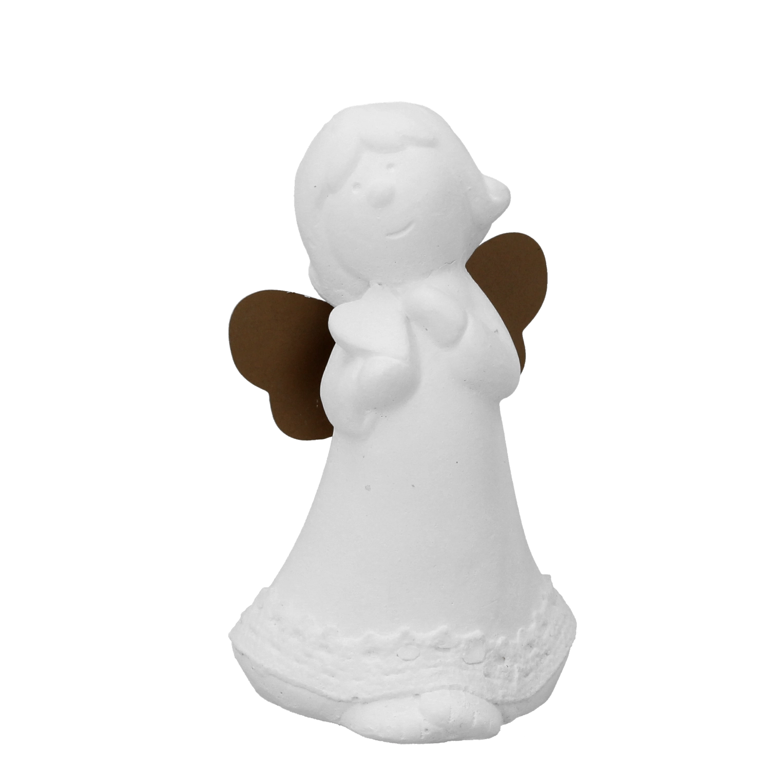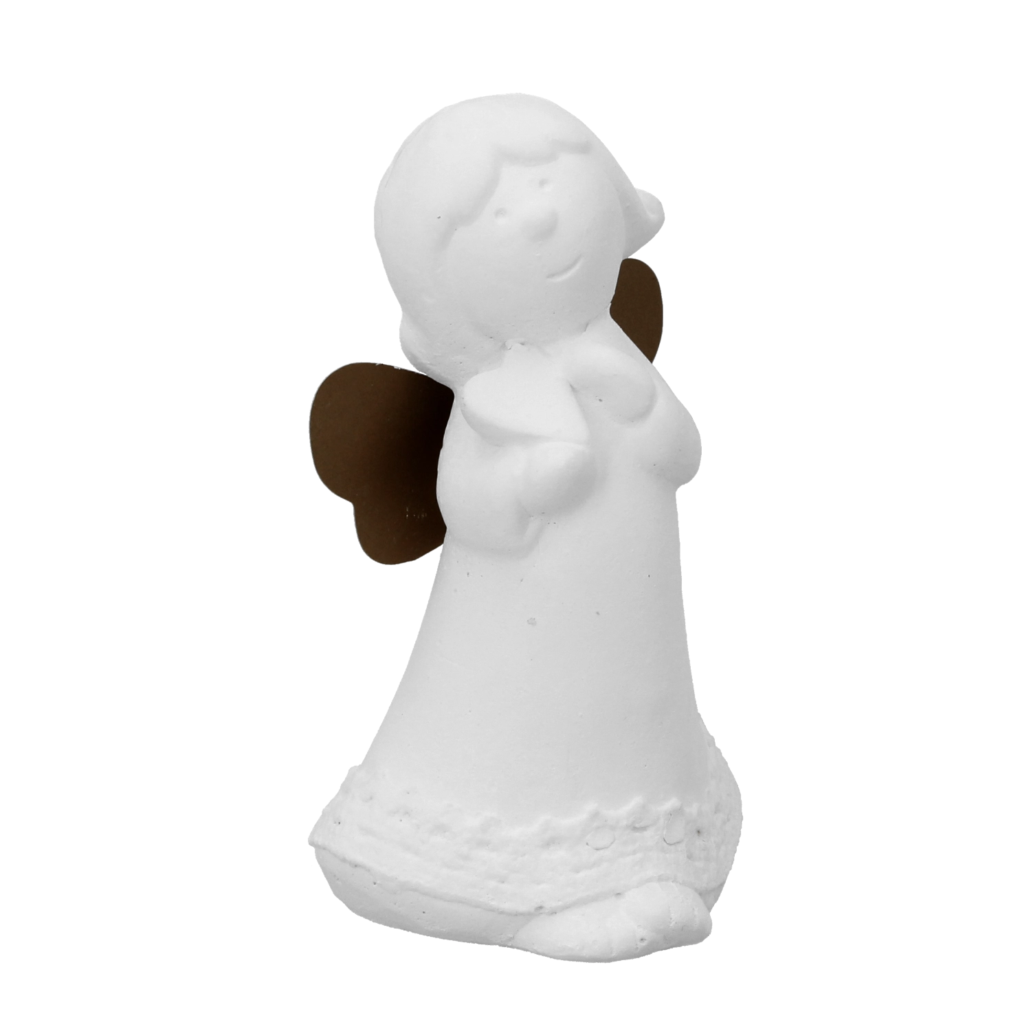 Denne lille engel med hjerte er fremstillet af kvalitetskeramik, som sikrer holdbarhed og lang levetid. Den gyldne overflade giver indretningen et strejf af elegance og harmoni, uanset om du placerer den i stuen, soveværelset eller entréen.