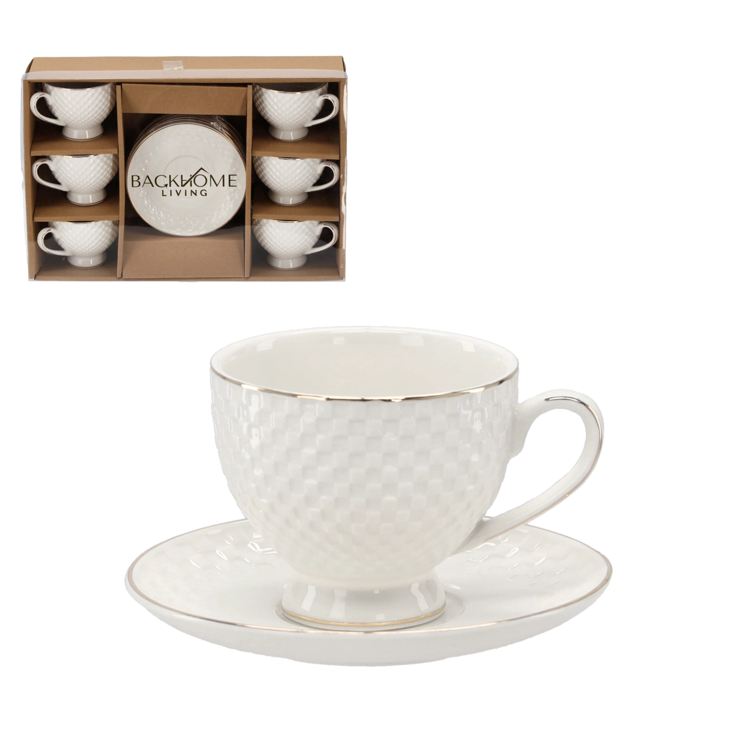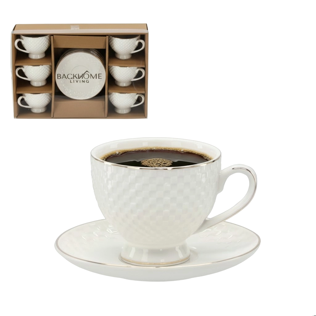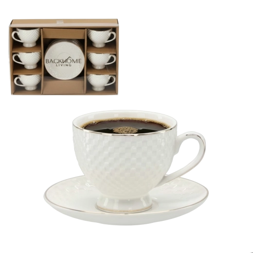 Dette stilfulde sæt kopper med underkopper forener elegance og praktikalitet. Den prægede overflade skaber en attraktiv struktur, og den gyldne dekorative stribe understreger det luksuriøse udtryk, som tager sig godt ud på ethvert bord.