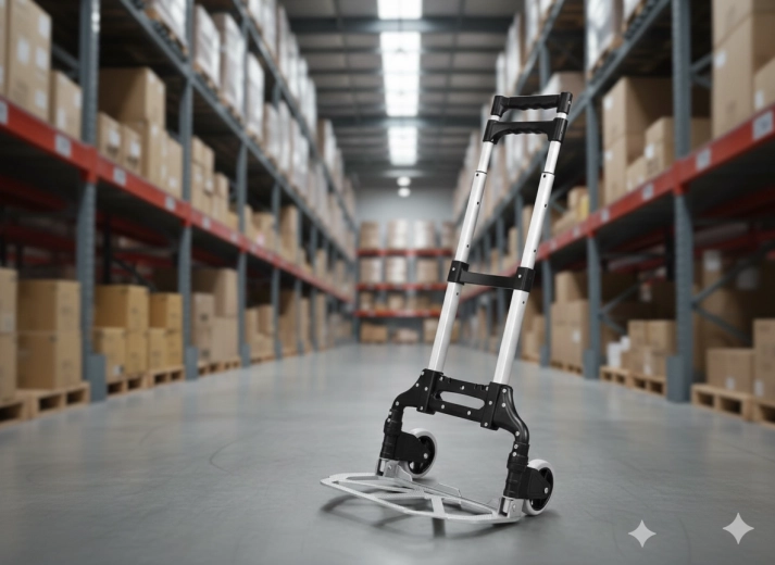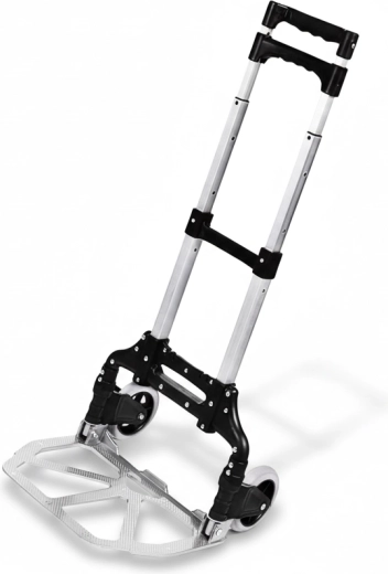 Den praktiske aluminiumsvogn kombinerer lav vægt, stiv konstruktion og hurtig sammenklapning på få sekunder. Teleskopskaftet giver behagelig betjening for brugere i forskellige højder, og den store, nedklappelige læsseplade giver stabil støtte til kasser og pakker.