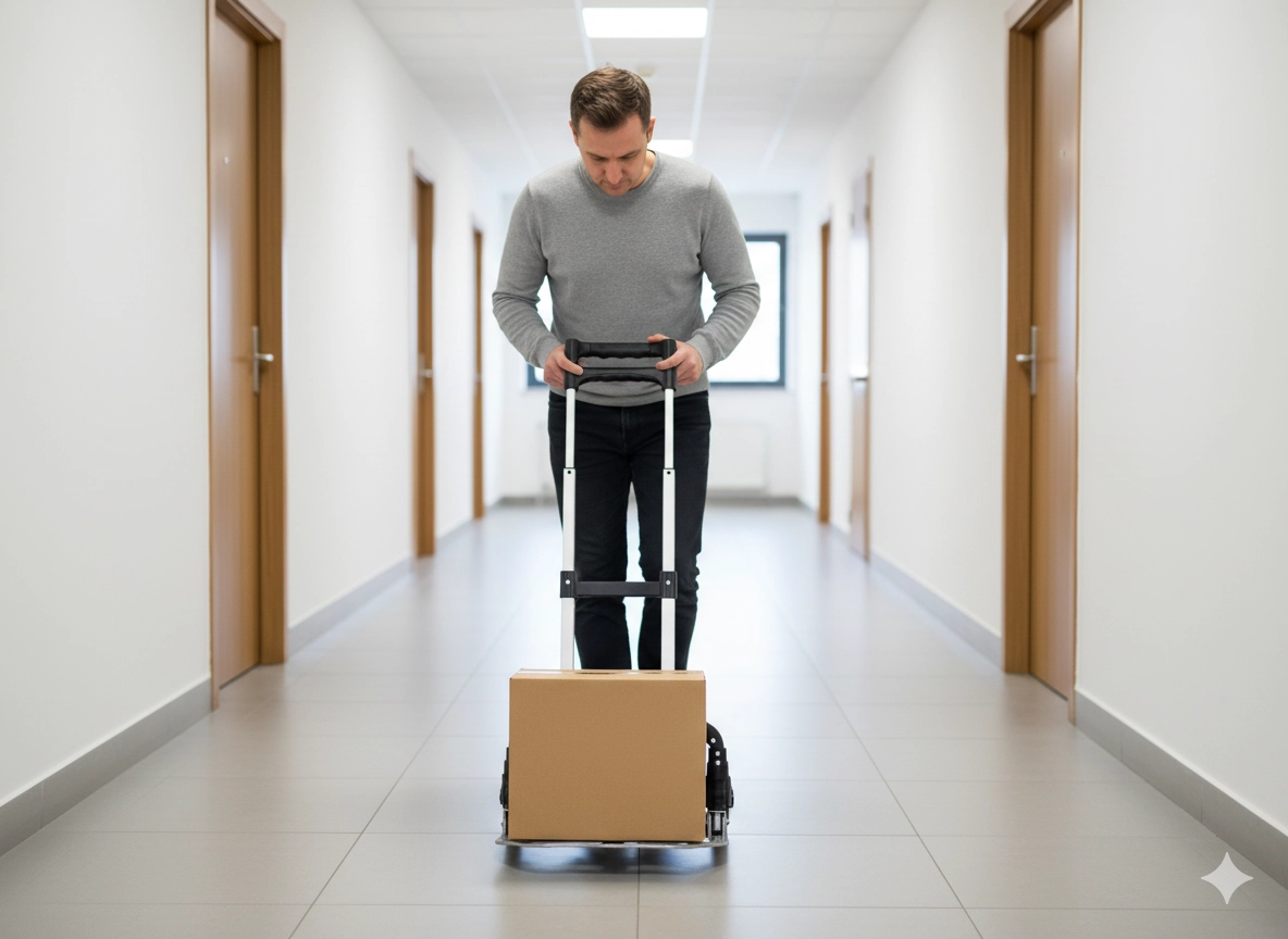 Justerbar skafthøjde og en bred, sammenklappelig base sikrer komfortabel og sikker transport af kasser og bagage.