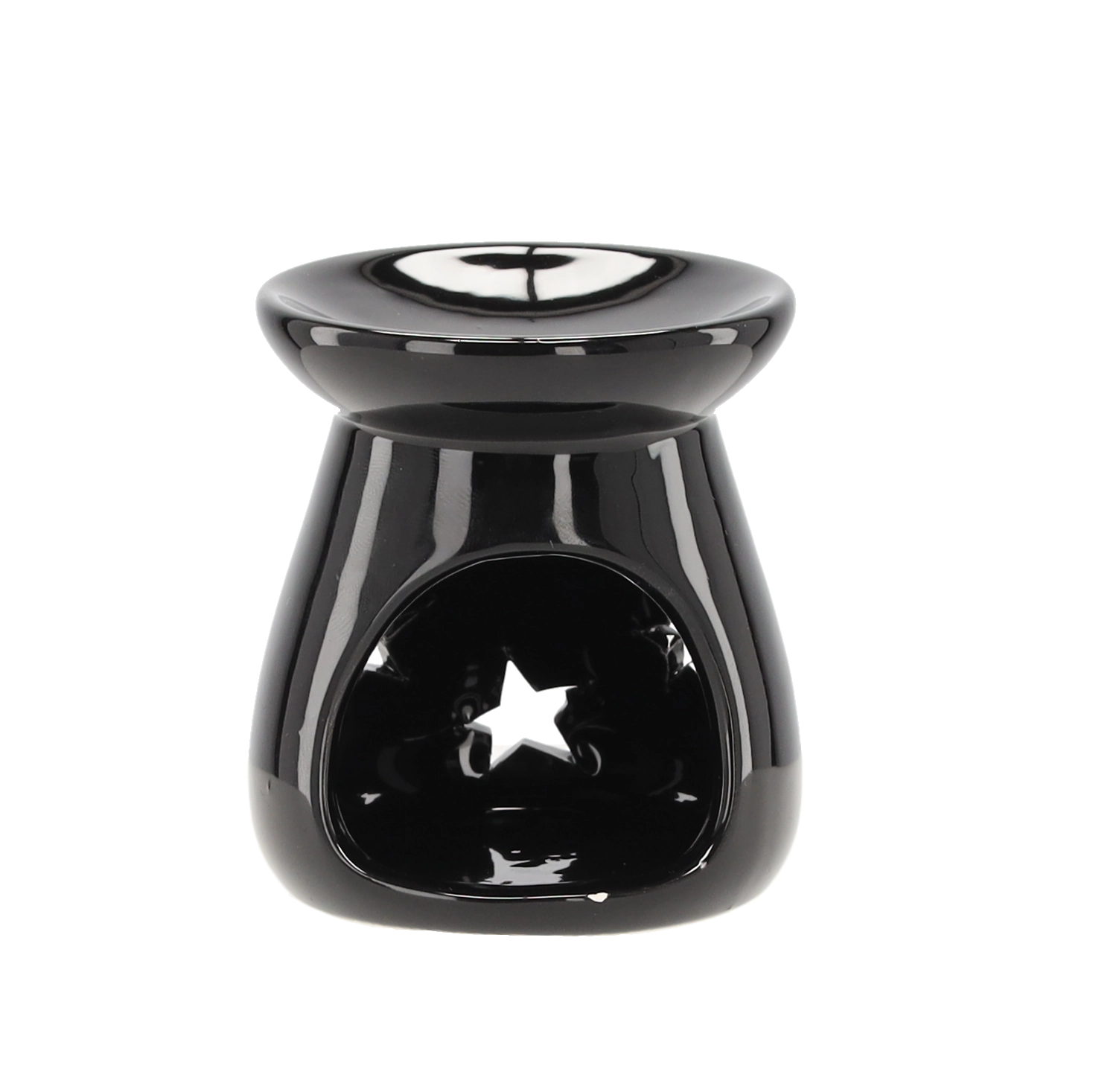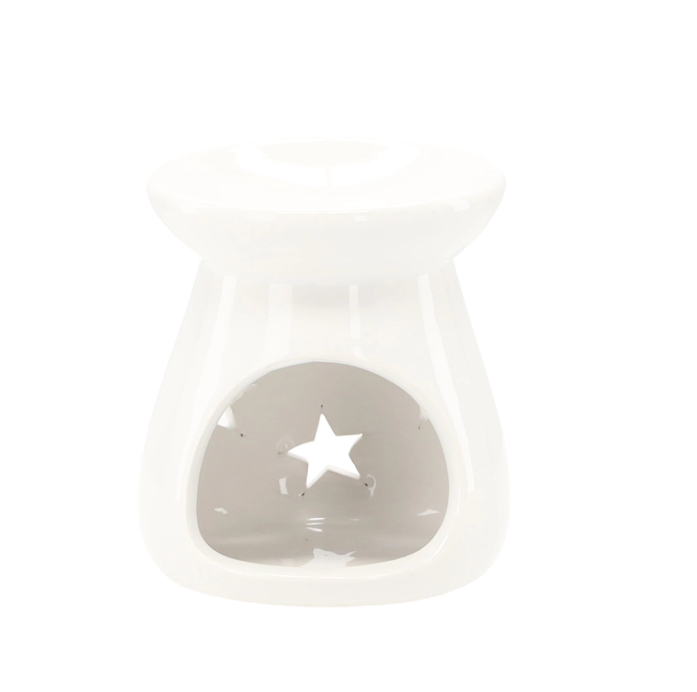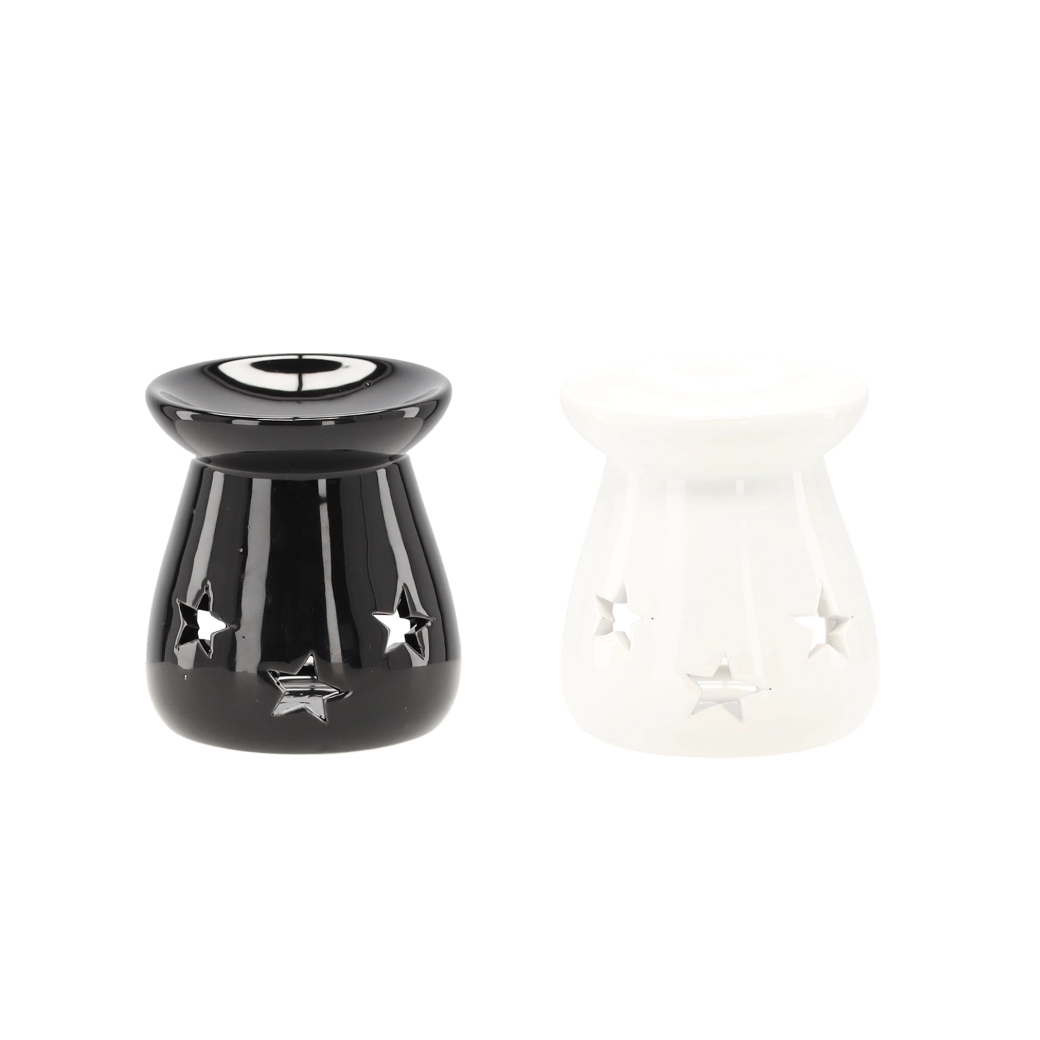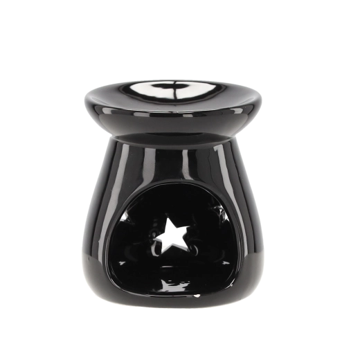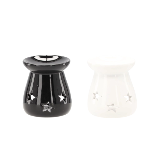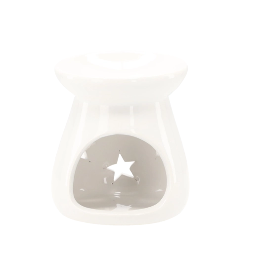 Den stilfulde aromalampe i glaseret keramik giver fine lyseffekter takket være stjerneformede udskæringer. Den øverste skål er beregnet til duftvoks eller æteriske olier, og den nederste åbning rummer et klassisk fyrfadslys. De kompakte mål 7 × 8 cm gør den nem at placere på en hylde, sofabord eller vindueskarm.