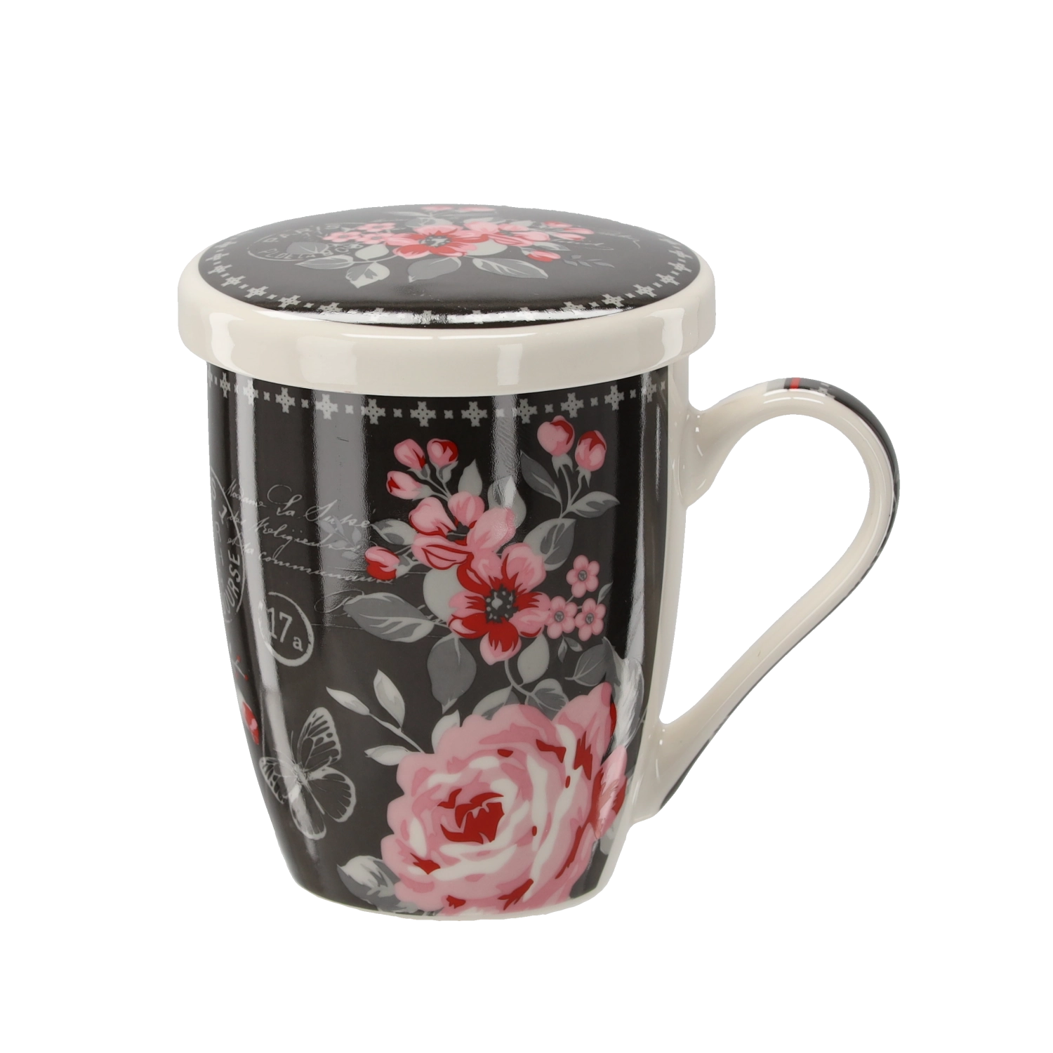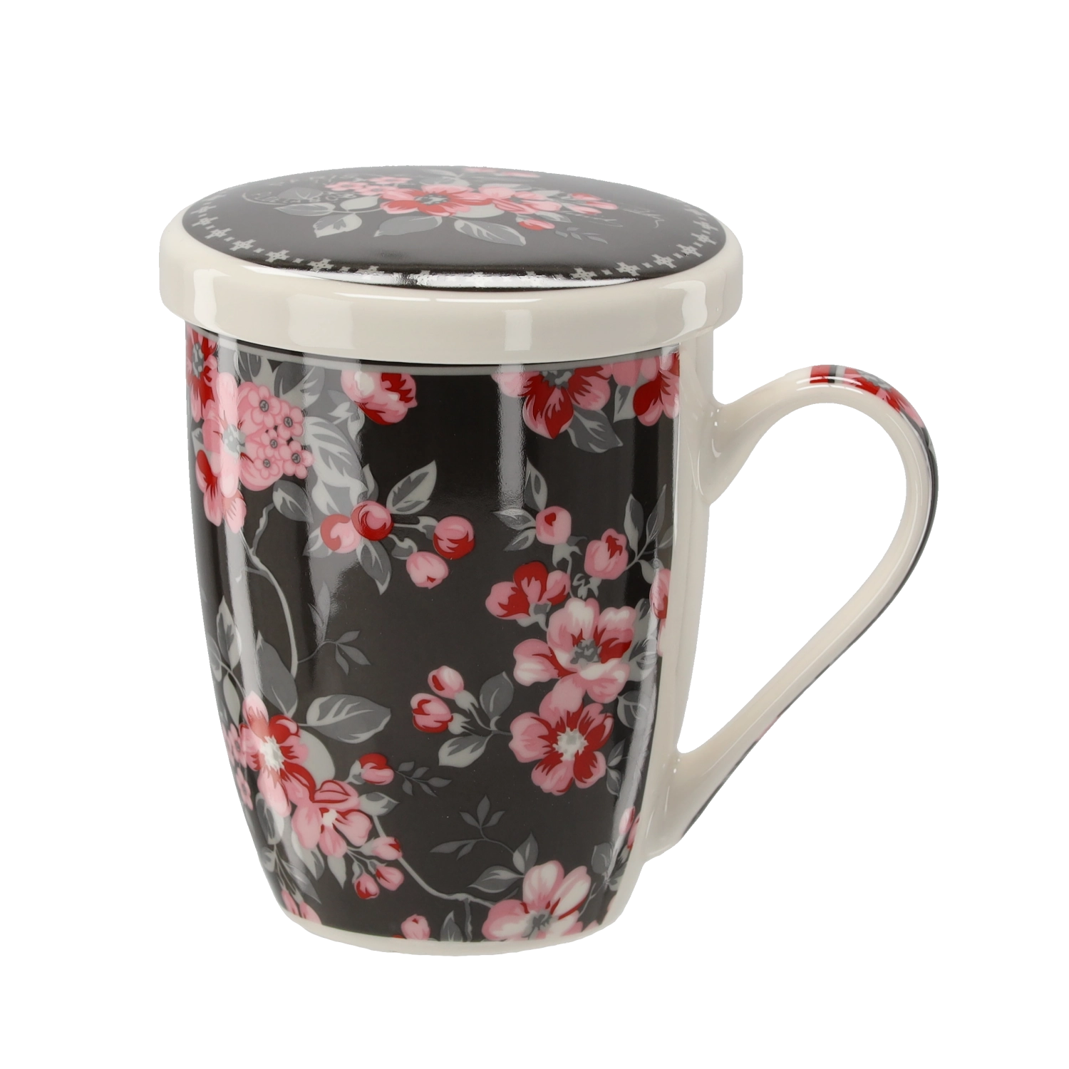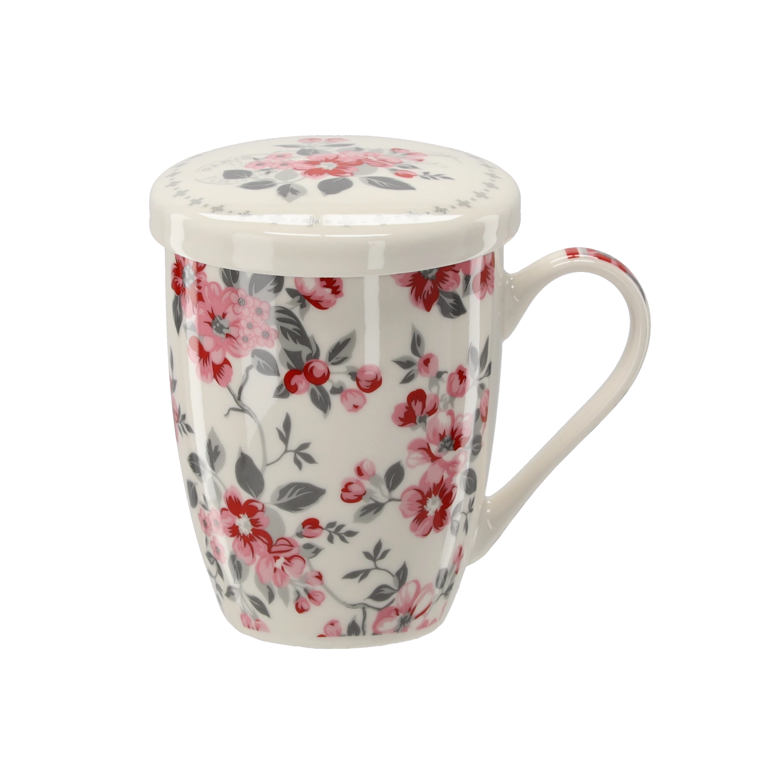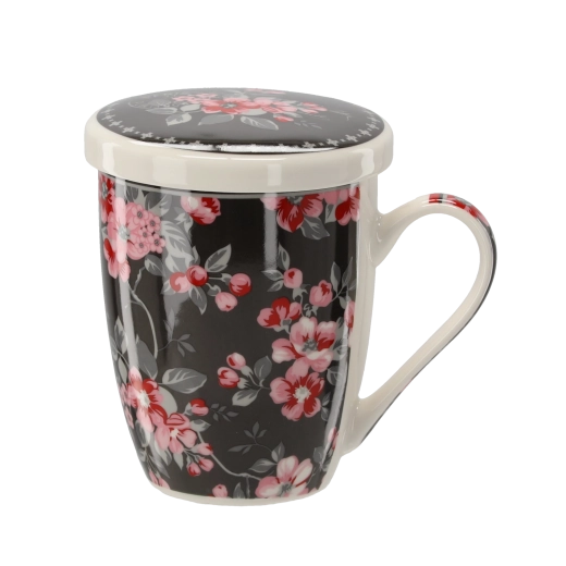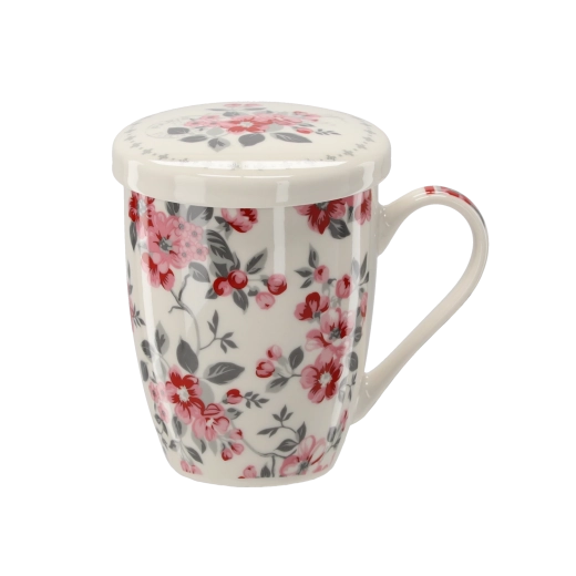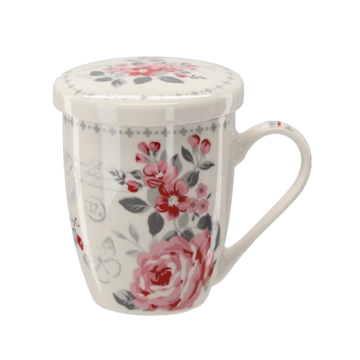 Elegant porcelænskop med en kapacitet på 340 ml, udstyret med låg og integreret si for nem udtrækning af løs te. Holder drikken varm længere, giver mulighed for tilberedning direkte i koppen og prydes af friske blomster mønstre, som giver borddækningen et strejf af stil.