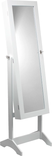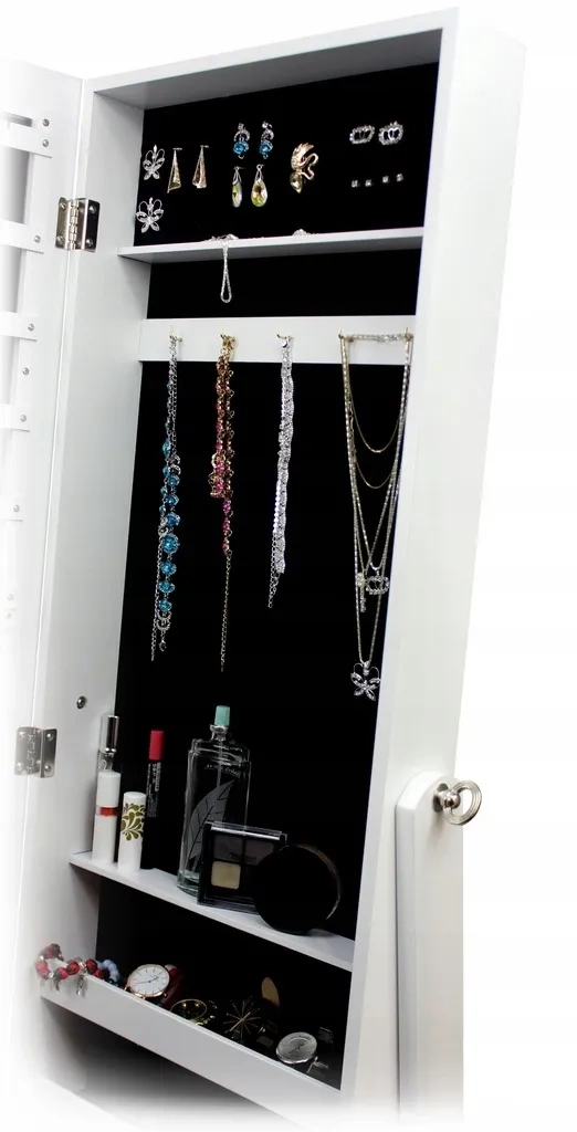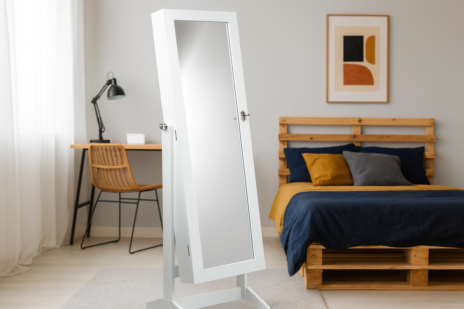 Elegant og rummeligt smykkeskab med fritstående fuldlængdespejl, der tilbyder organiseret opbevaring af smykker, sikker låsning med nøgle og moderne hvidt design, som passer til ethvert soveværelse. Det bløde plyssede interiør beskytter dine skatte, og det store spejl gør både påklædning og daglig styling lettere.