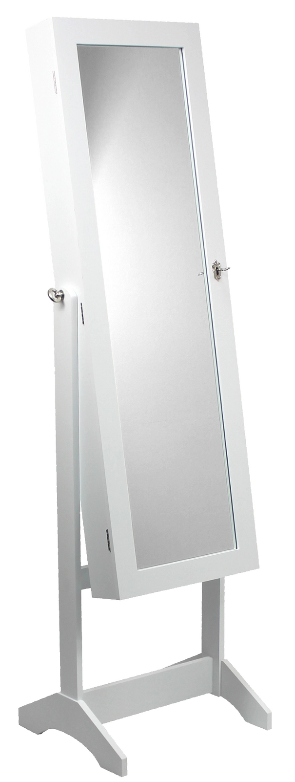 Oplev den praktiske kombination af opbevaringsplads til smykker og et fuldt funktionelt fritstående spejl. Det hvide smykkeskab GRAND byder på en gennemtænkt inddeling – kroge til halskæder, lister til øreringe, rum til ringe, ure og små kosmetiske accessories. Det bløde polstrede plyss beskytter smykker mod ridser, og låsning med nøgle sikrer privatliv og tryghed.