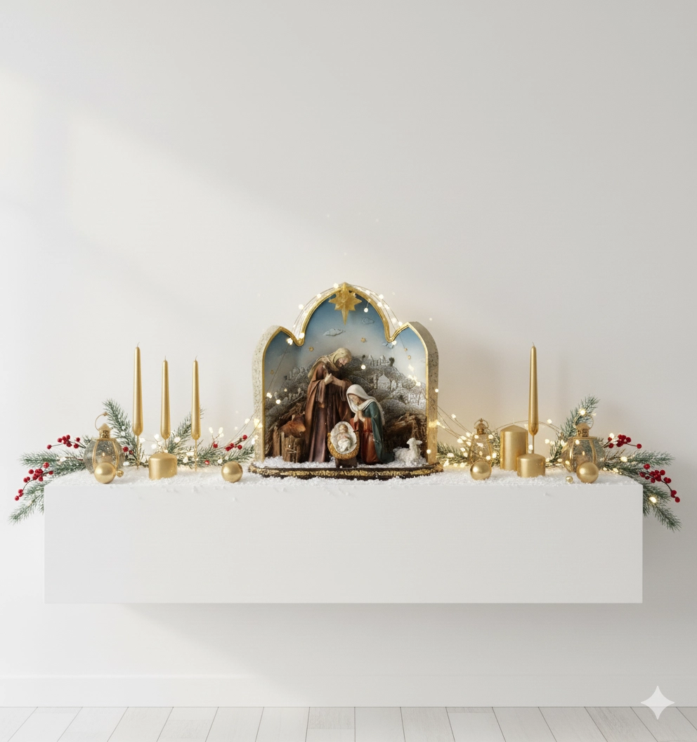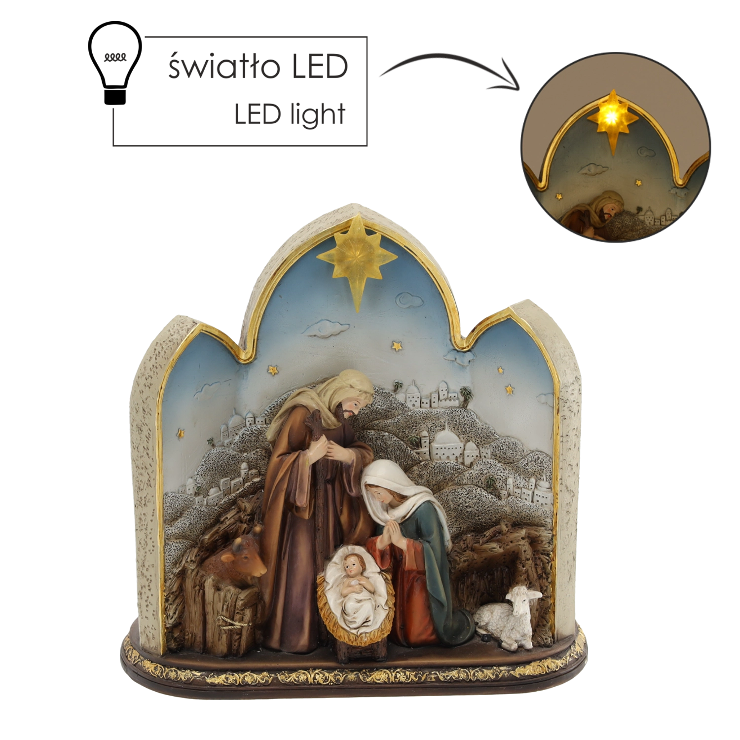 Denne dekorative krybbefigur med Den Hellige Familie i en buet ramme med fine gyldne accenter bringer et traditionelt julemotiv i en moderne udformning. Det varme LED-baglys i stjernen skaber en behagelig atmosfære og giver udsmykningen et festligt præg.