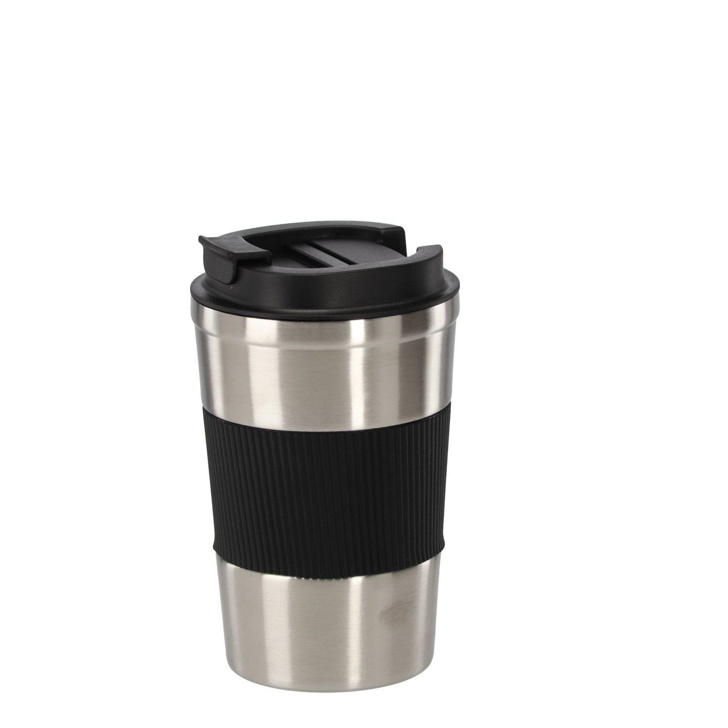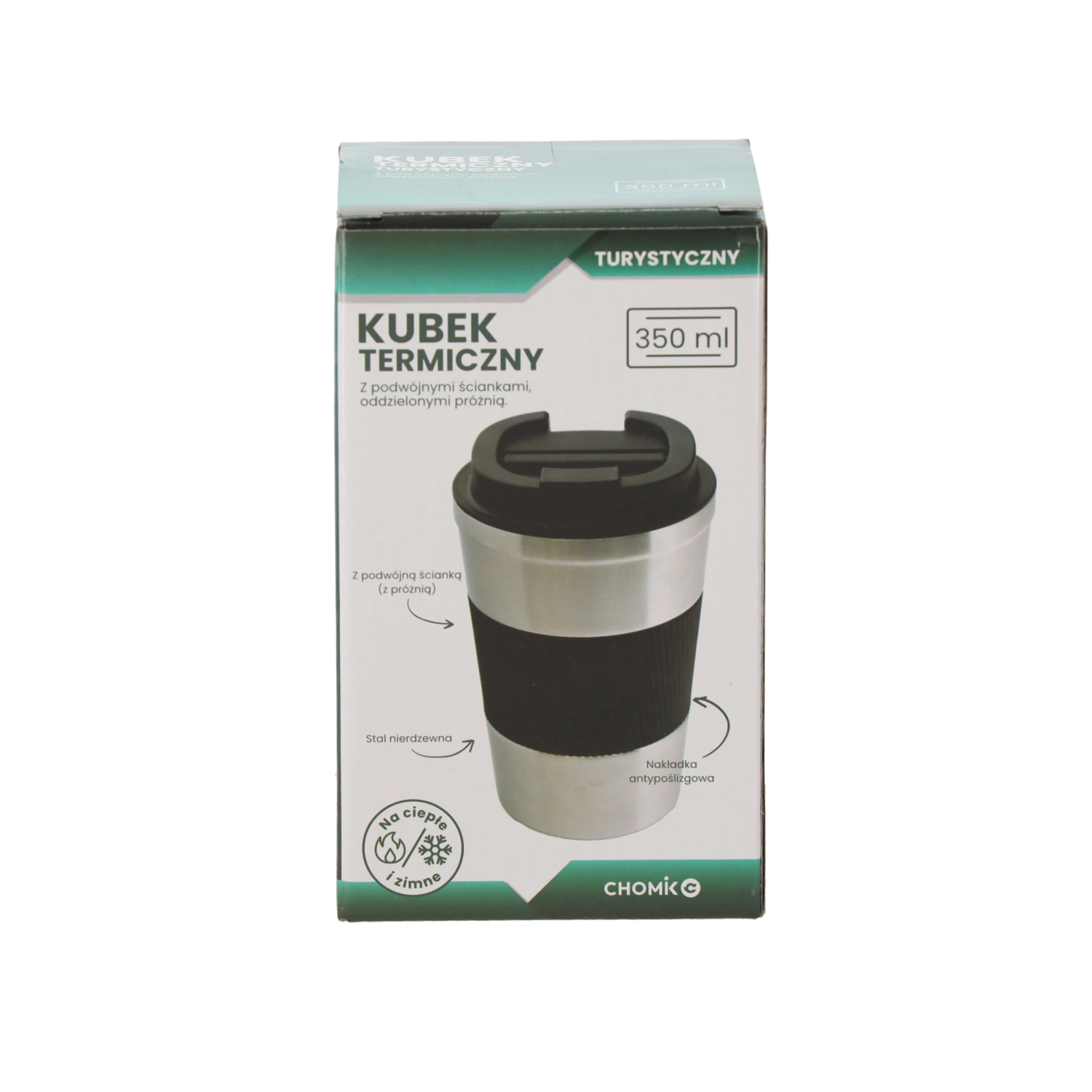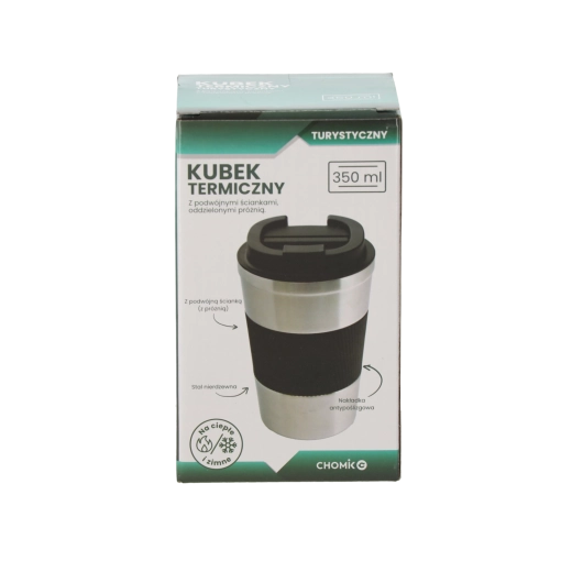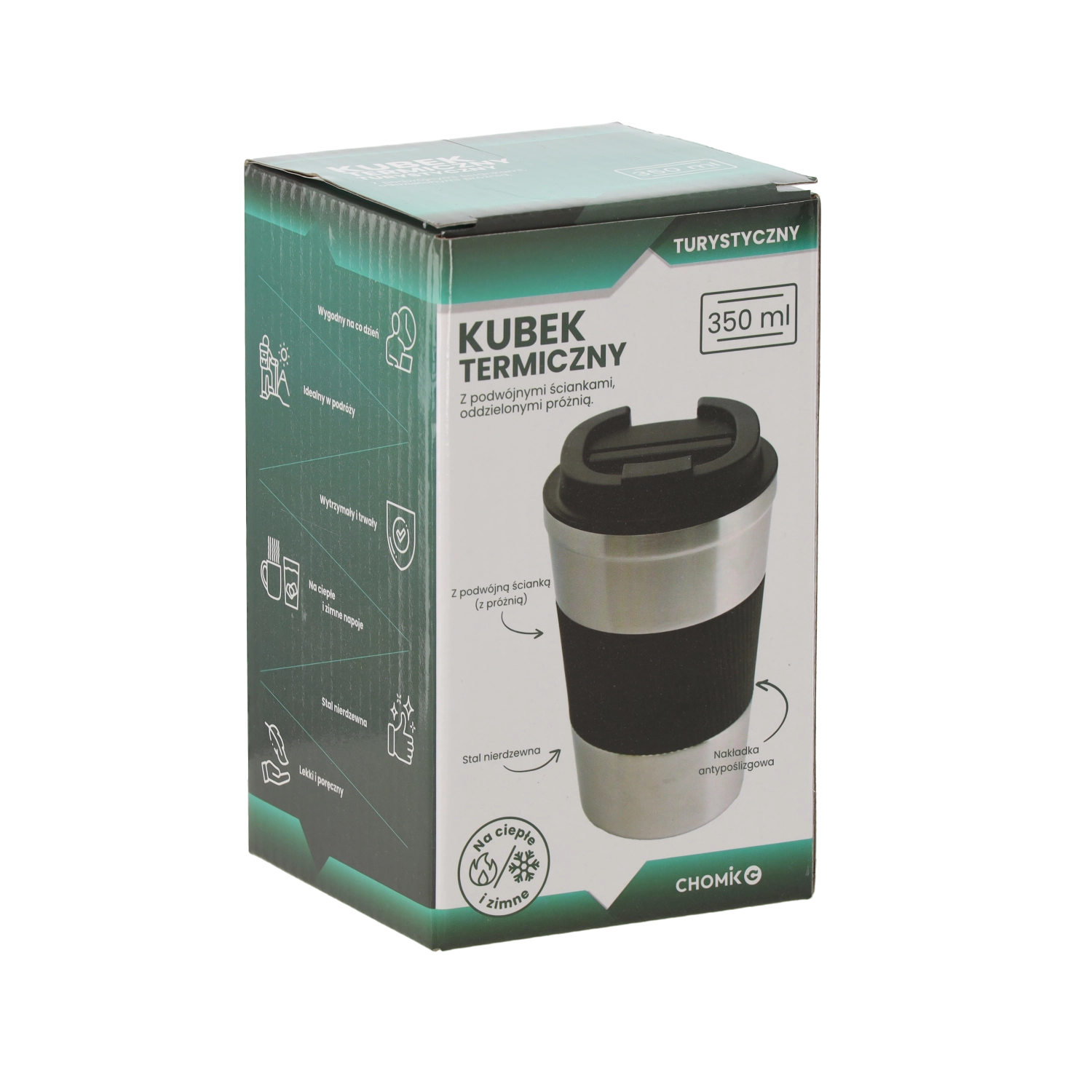 Praktisk termokrus med kapacitet på 350 ml af kvalitets rustfrit stål med vakuumkonstruktion, der holder drikken varm eller kold i op til 4 timer. Har et skridsikkert silikonehylster for sikker greb, et skruelåg af holdbar PP og er egnet til opvaskemaskine. Den elegante overflade i rustfri ståls naturlige farve passer til arbejde, bil og udflugter.