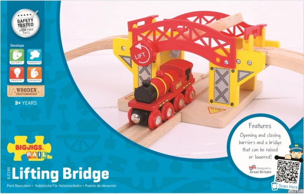 Træbro med løft er det perfekte supplement til enhver togbanesæt. Denne bro er kompatibel med alle trætogbaner på markedet og er lavet af kvalitets- og ansvarligt indhentede naturlige materialer. Konstruktionen, der støtter kreativitet, fingerfærdighed og koordination, tilbyder realistiske funktioner som løft af broen.