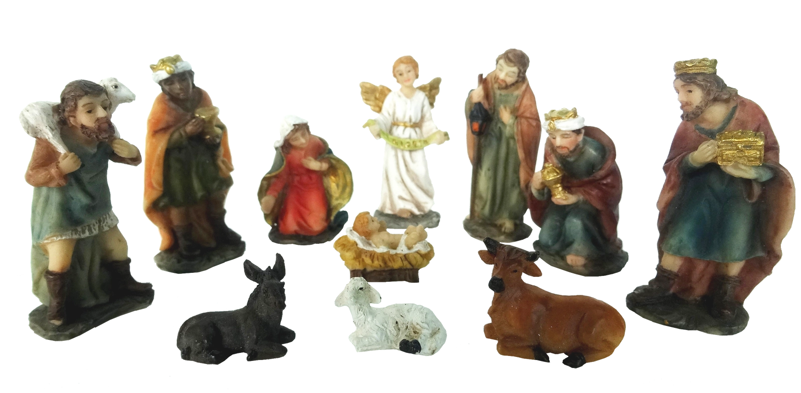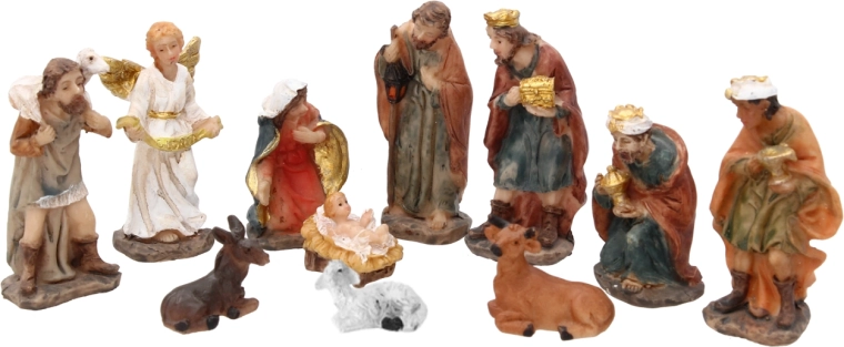 Dette komplette sæt omfatter alle nøglefigurer til den klassiske fremstilling af krybben: Josef, Maria, Jesusbarnet i krybbe, engel, hyrde, De tre vise mænd og dyr (æsel, får, okse). Hver figur er fremstillet af kvalitetspolyresin, som er robust, farveægte og modstandsdygtig over for skader.