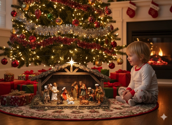 Hver figur er omhyggeligt håndmalet i naturlige nuancer med gyldne accenter, som giver scenen dybde og et festligt udtryk.