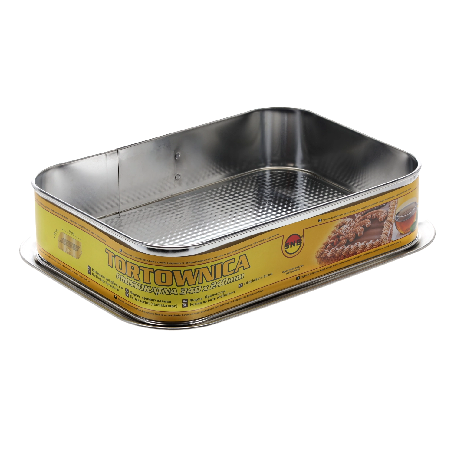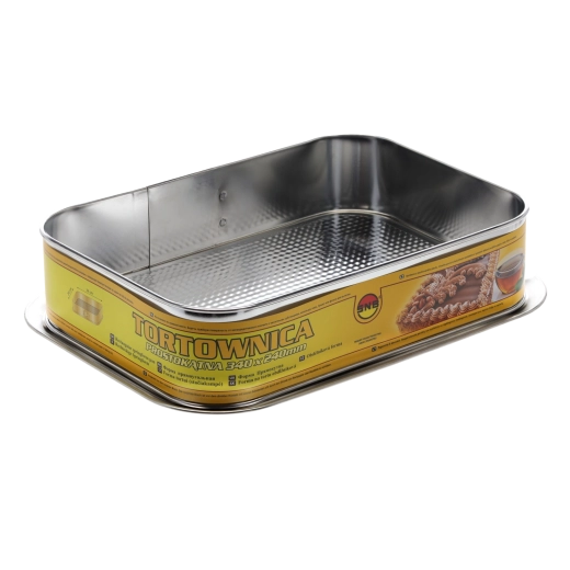 Praktisk rektangulær kageform på 34 × 24 cm med rillet bund for jævn bagning og en sprød struktur i dejen. Fremstillet af forzinket stål for høj holdbarhed og lang levetid. Aftagelig bund gør det nemt at få kager og desserter ud uden skader. Velegnet til gas- og elektriske ovne og nem at rengøre og vedligeholde.