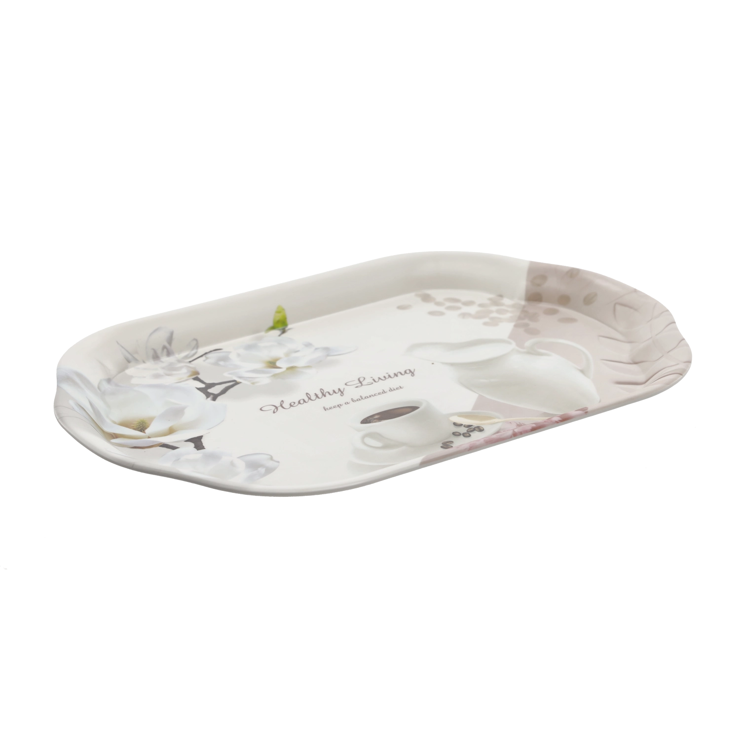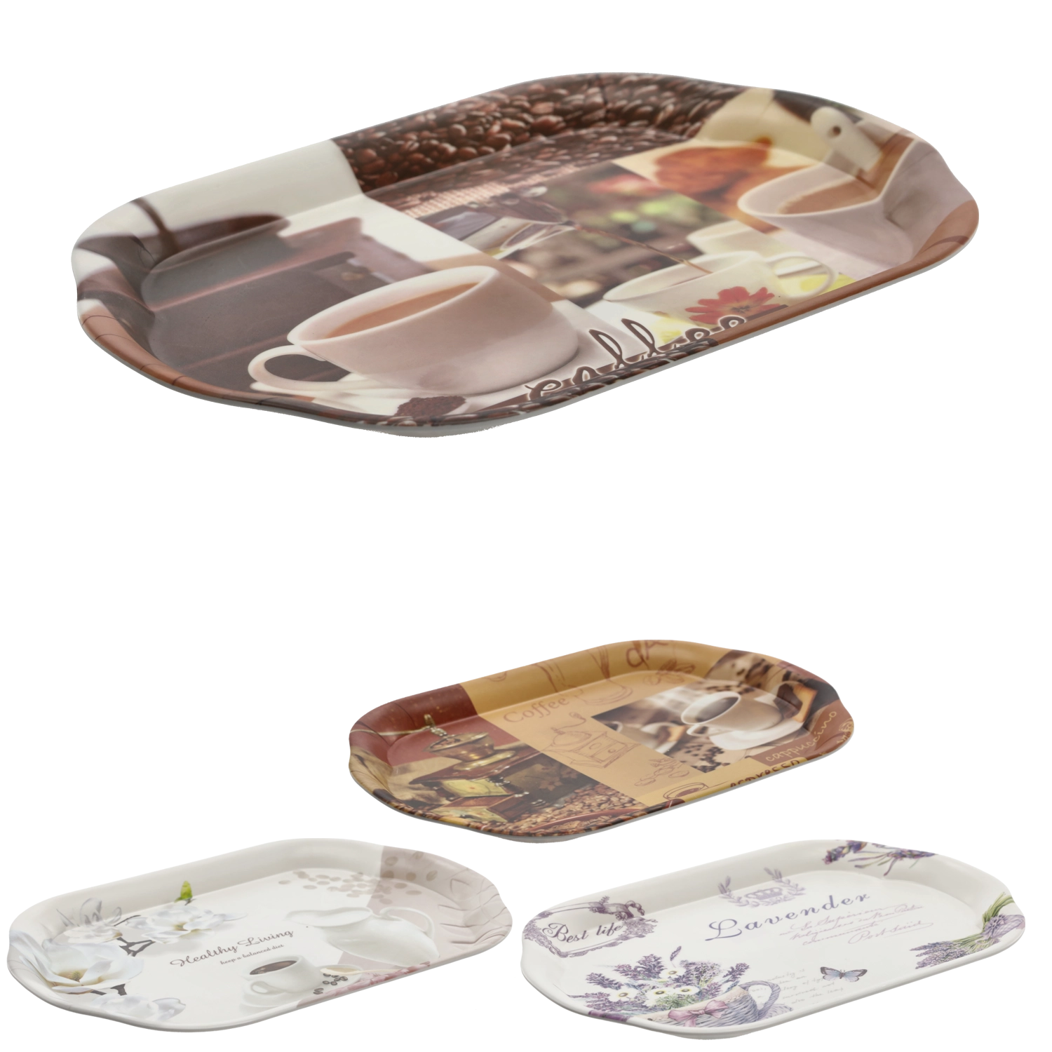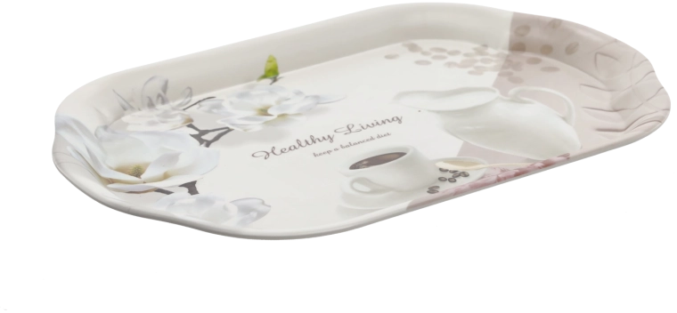 Den elegante ovale serveringsbakke i plast af høj kvalitet kombinerer praktikalitet med et attraktivt udseende. Den er let, men samtidig robust, så den klarer daglig brug i køkkenet, spisestuen og i haven. Det dekorative print passer perfekt til både moderne og rustikke interiører.