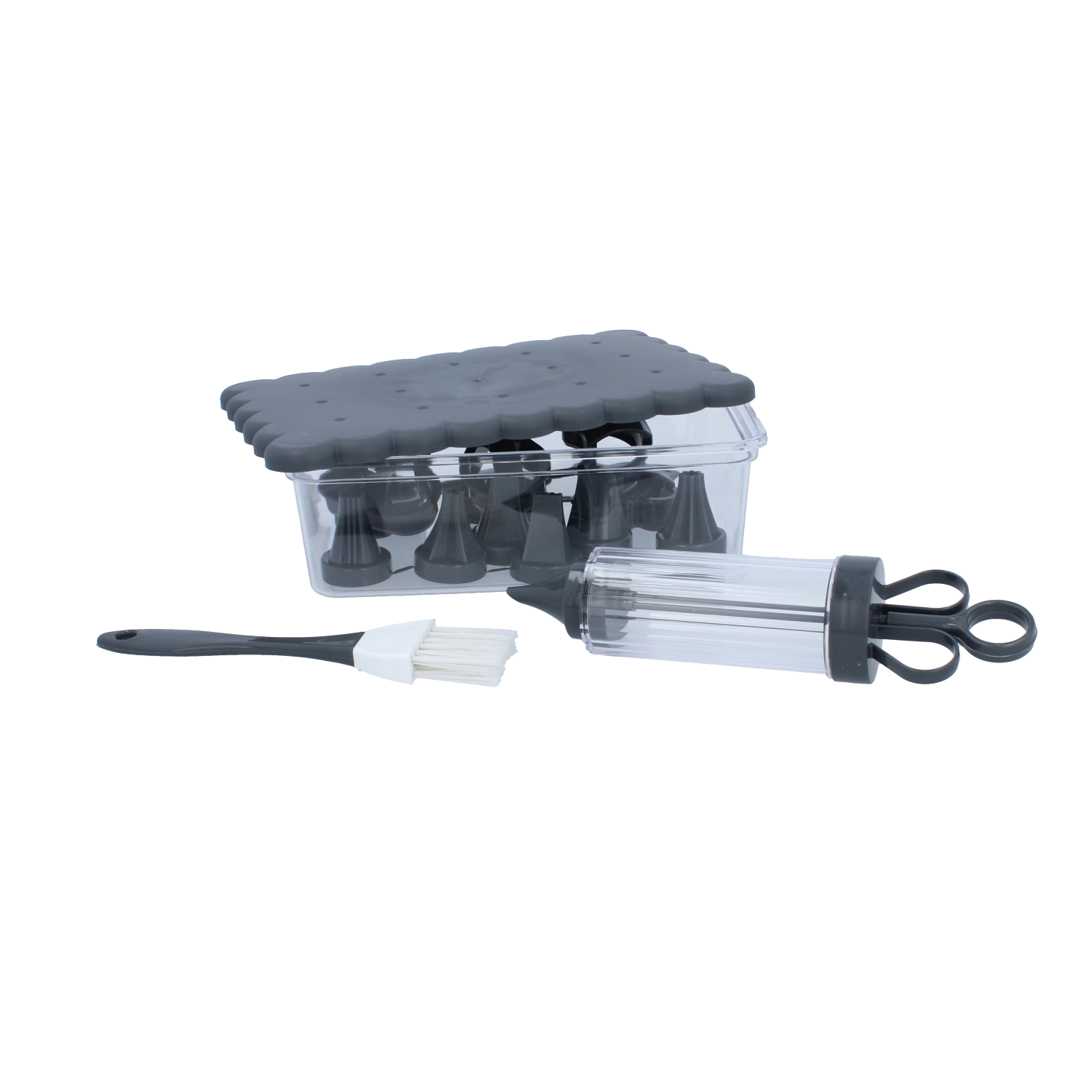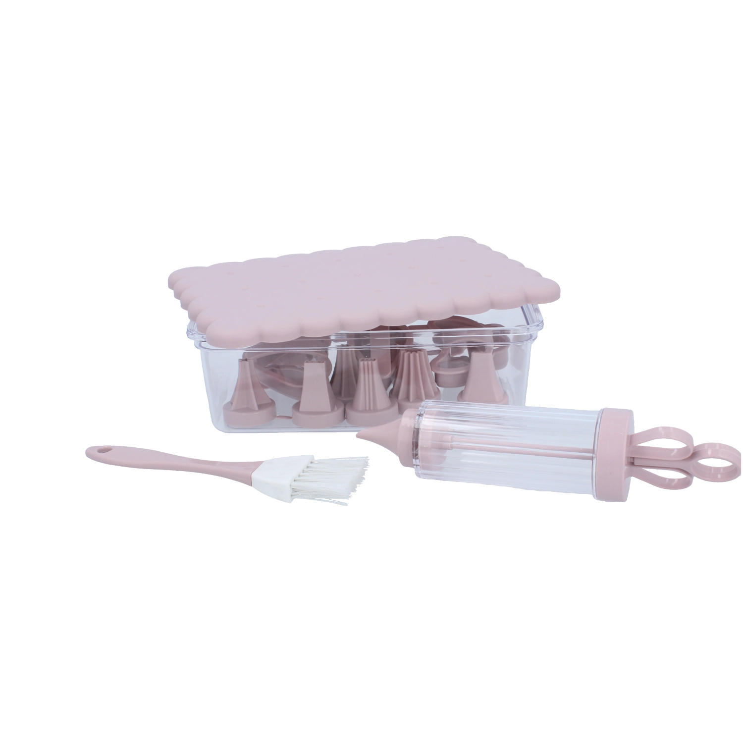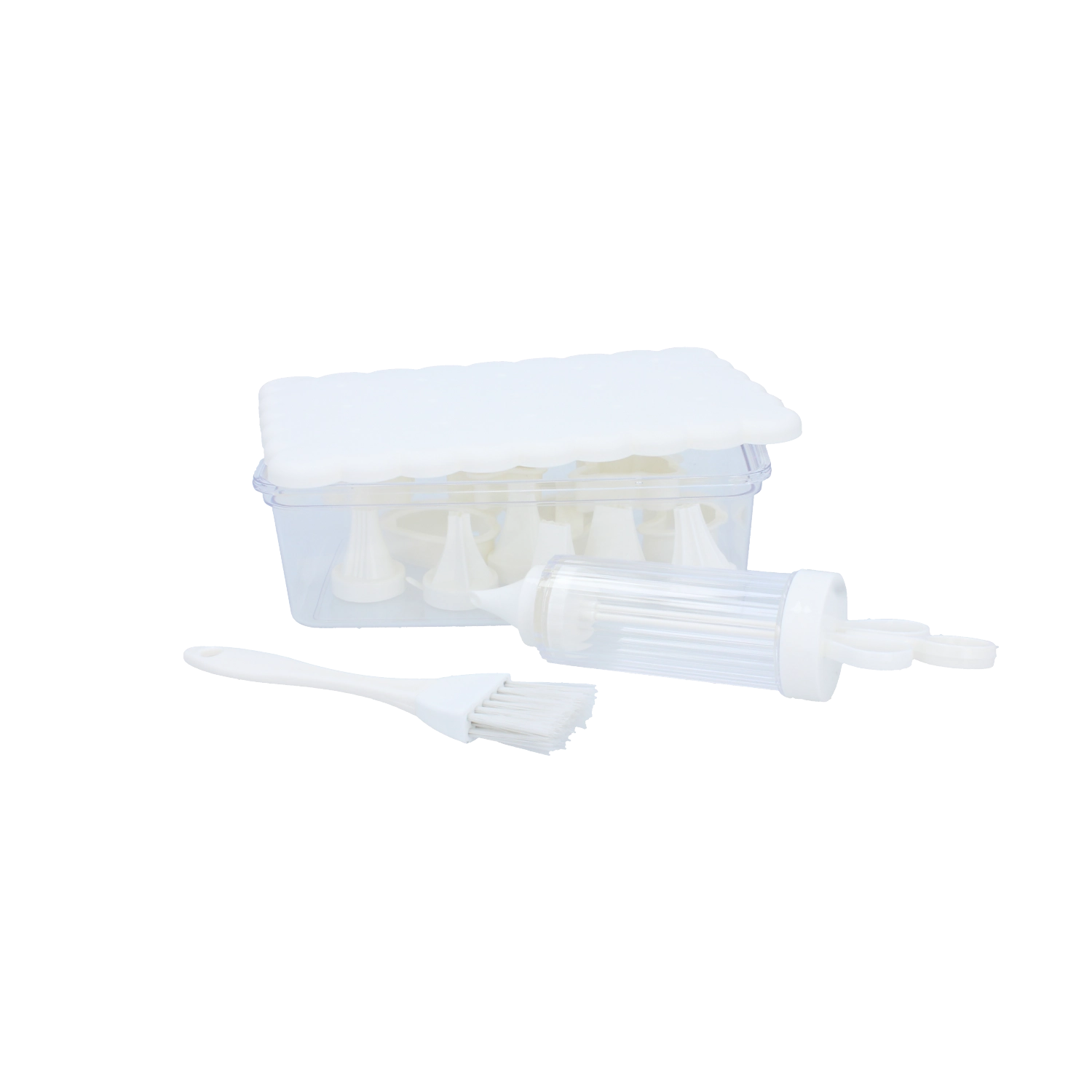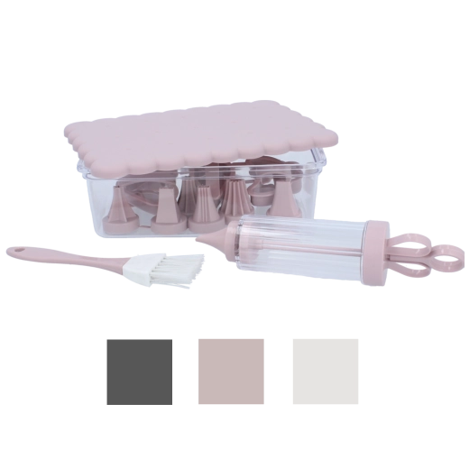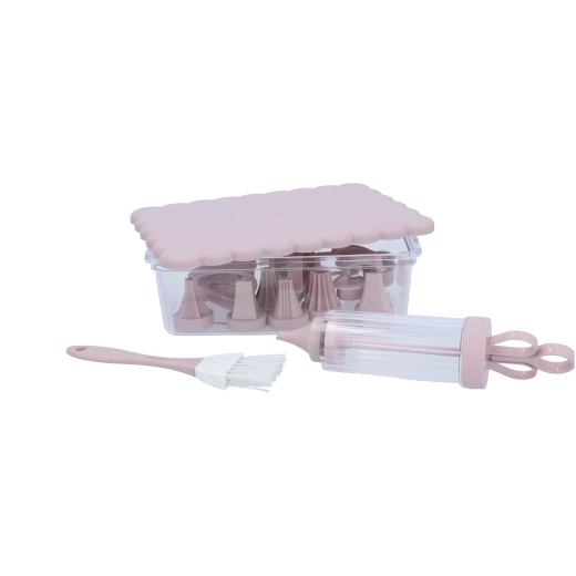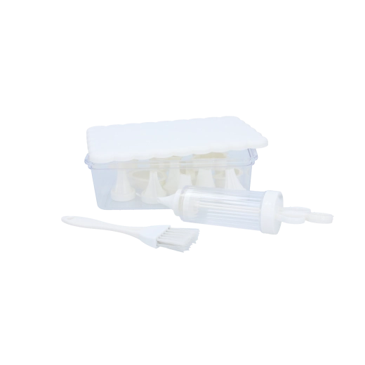 Komplet konditorsæt til hjemmebag og kreativ dekoration. Indeholder 16 praktiske dele, herunder udstikkere til småkager, dekorationssprøjte med udskiftelige tylle, pensel og en lukkbar beholder for nem opbevaring. Ideel til både begyndere og entusiastiske bagere, der vil skabe præcise dekorationer og smukt formet bagværk.