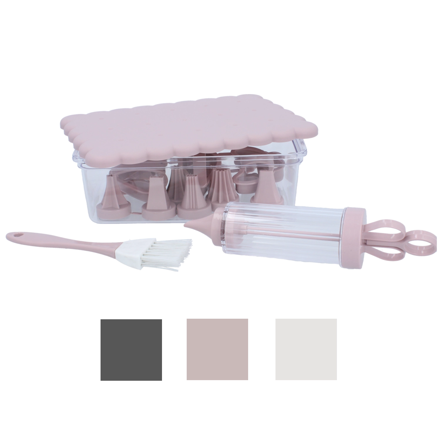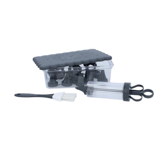 Sættet er velegnet til arbejde med deje, cremer og glasurer. Alt kan opbevares i en transportabel boks med låg, som holder redskaberne rene og altid lige ved hånden.