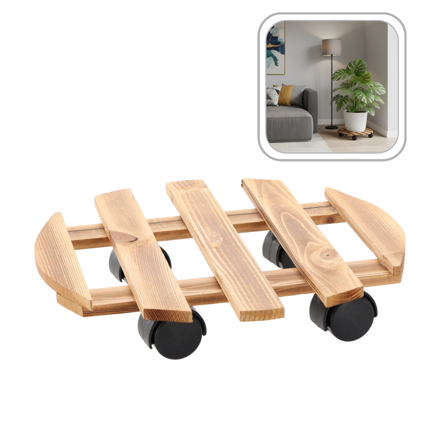 Praktisk træunderlag til urtepotte med fire hjul for nem flytning af planter uden at beskadige gulvet. Velegnet til indendørs brug, men fungerer også perfekt på balkon eller terrasse. Maksimal bæreevne 40 kg, diameter 36 cm.
