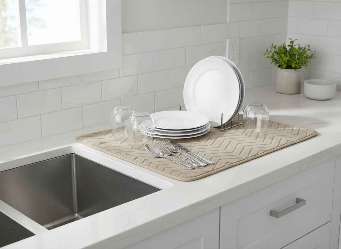 Hold køkkenvasken og bordpladen tør og ryddelig. Tørremåtten af 100% polyester-mikrofiber absorberer hurtigt fugt og giver en blød, sikker overflade til at sætte nyvasket service på. Den er et godt valg til daglig brug, især til skrøbelige glas og fint porcelæn.
