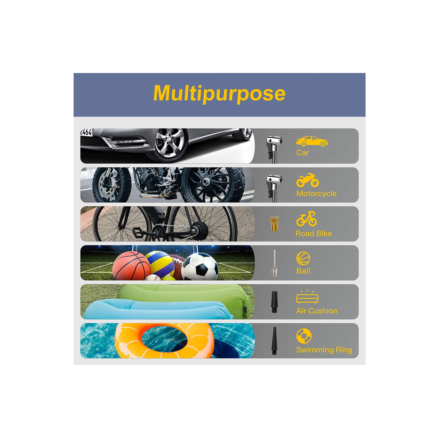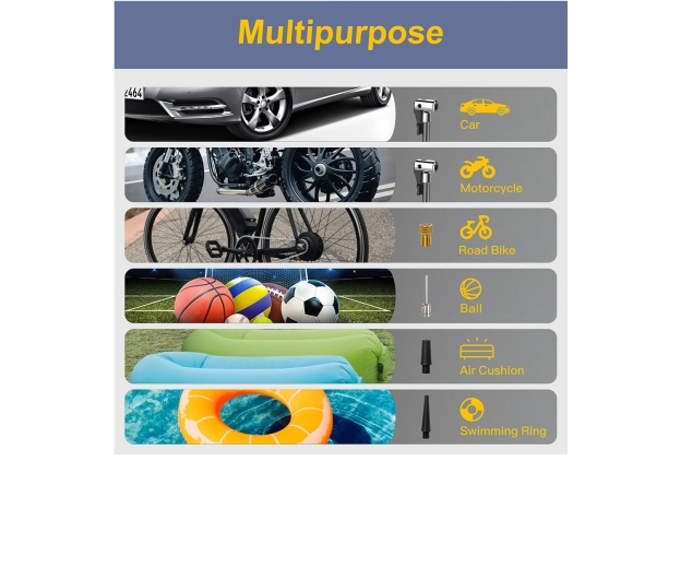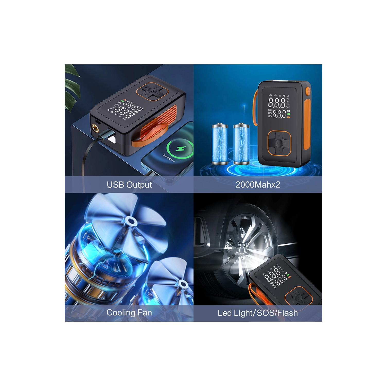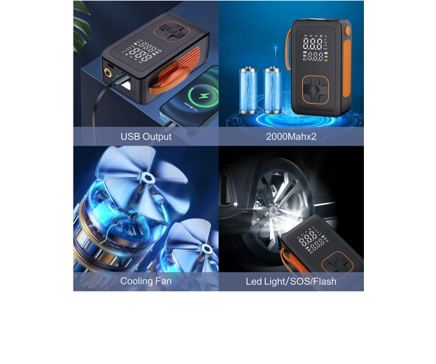 Vælg mellem 5 hurtigtilstande (bil, motorcykel, cykel, sportsbold, manuel) og 4 trykenheder (PSI, KPA, BAR, KG/CM²). Manuel tilstand med hukommelse gemmer den seneste indstilling. En integreret køleblæser forlænger levetiden, og en afblæsningsventil gør finjustering af trykket nemt. LED-lygte med 3 tilstande (standard, SOS, blink) øger sikkerheden ved arbejde i mørke.
