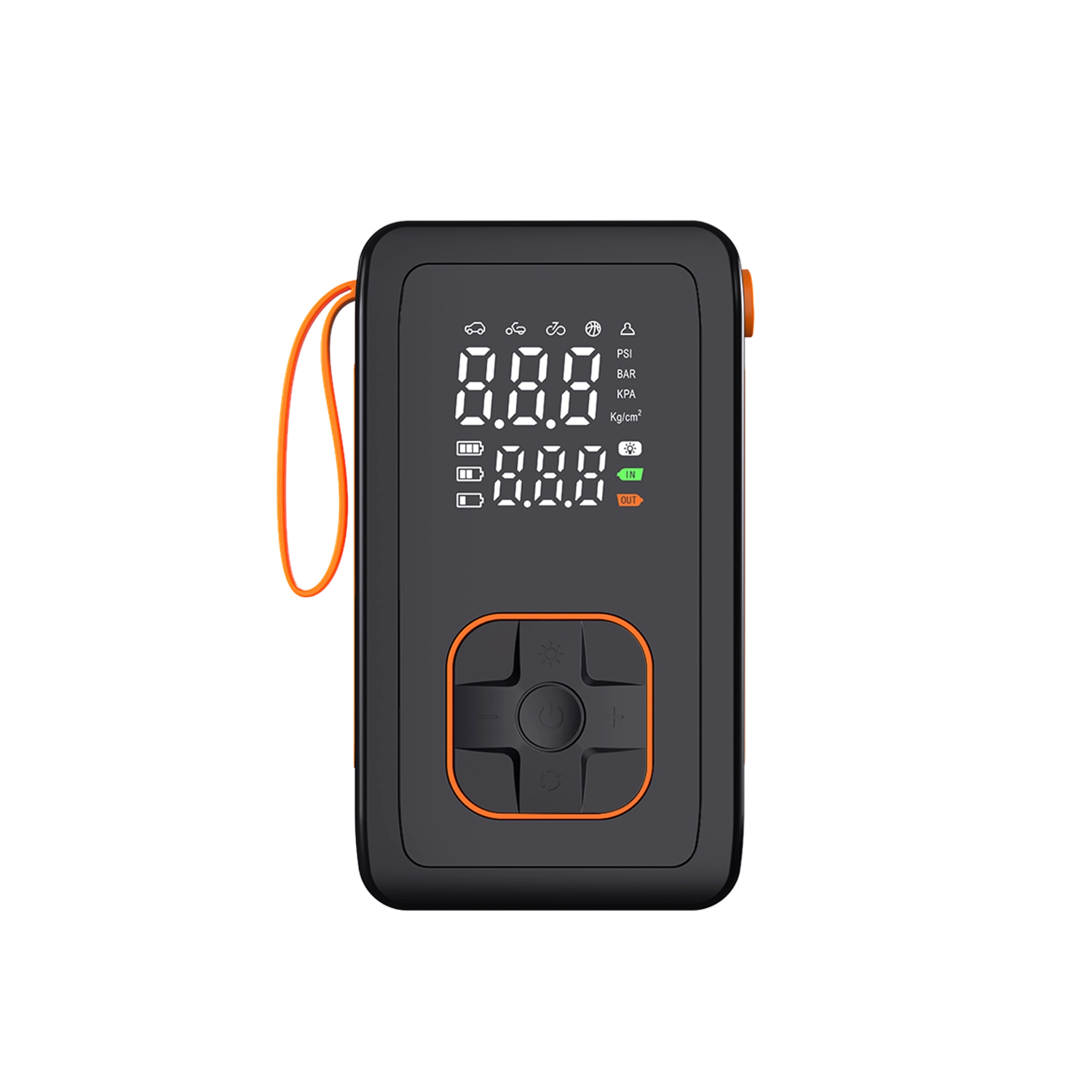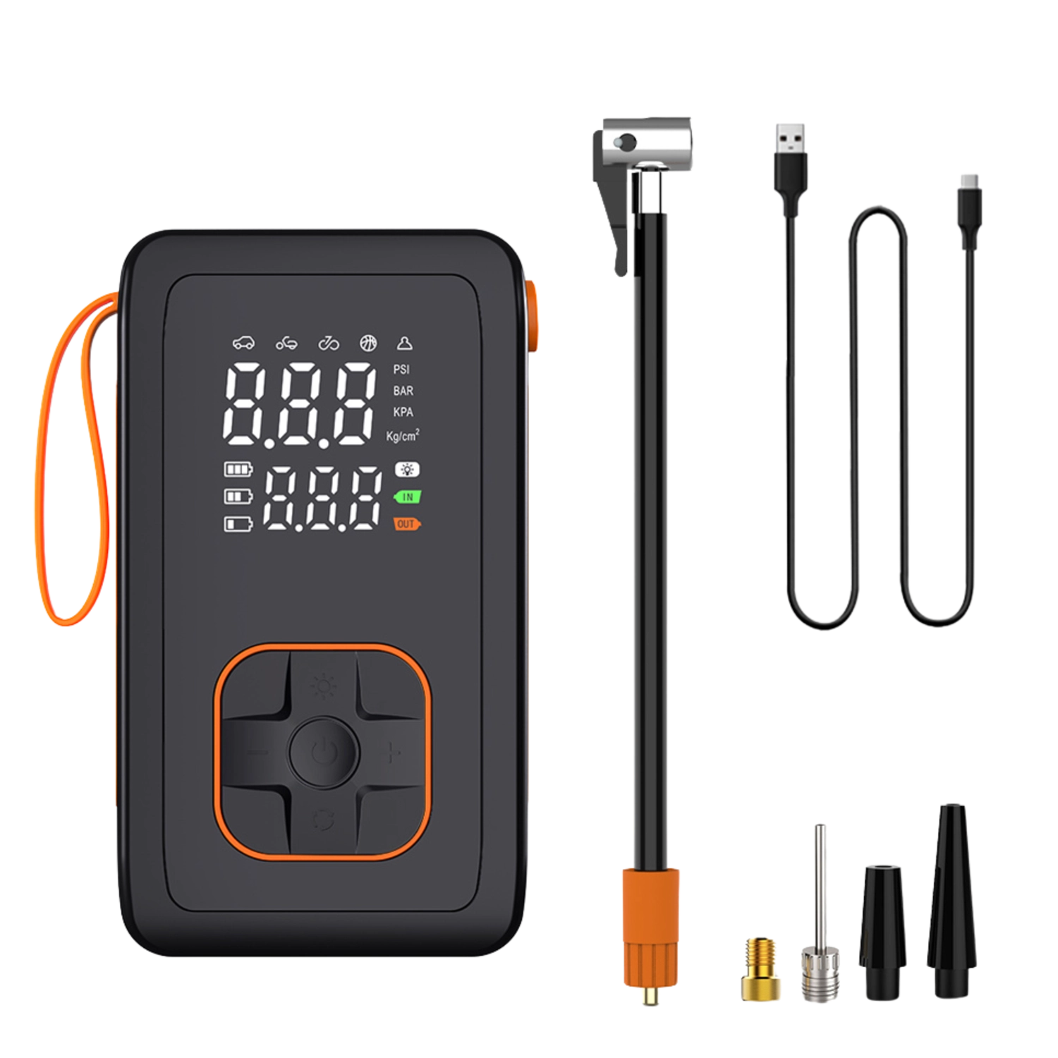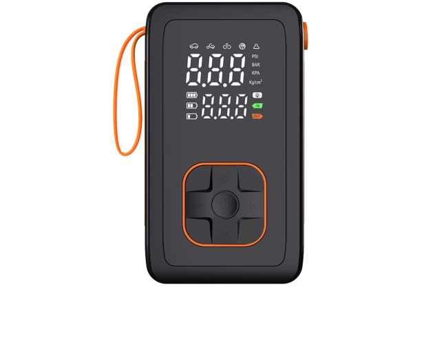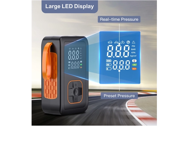 Denne bærbare 7,4 V batteripumpe kombinerer kraftig oppumpning op til 150 PSI / 10,3 BAR med en praktisk powerbank. Takket være de kompakte mål og det praktiske bærehåndtag er den ideel til rejser, bilen og værkstedet. Det dobbelt digitale display viser både indstillet og aktuelt tryk, mens automatisk slukning stopper pumpningen, når målet er nået.