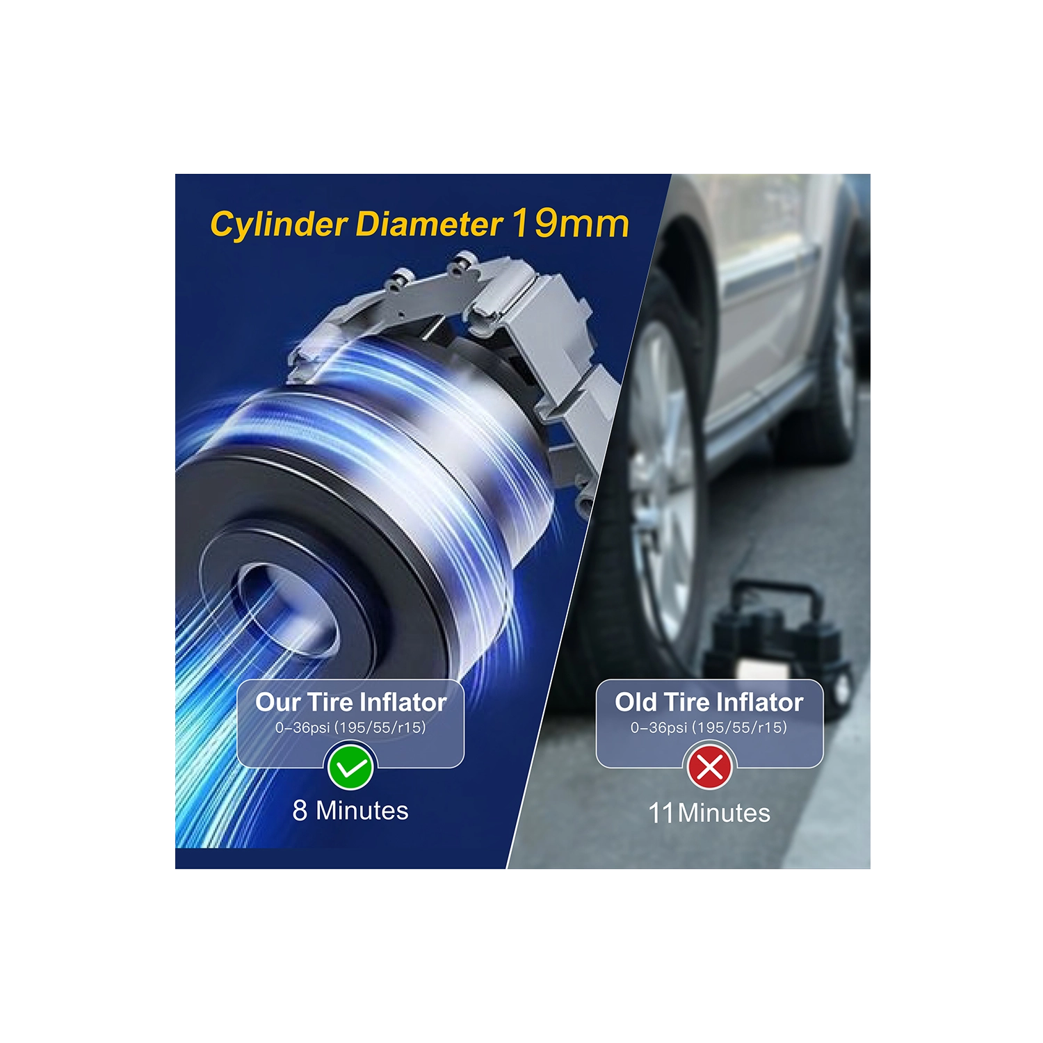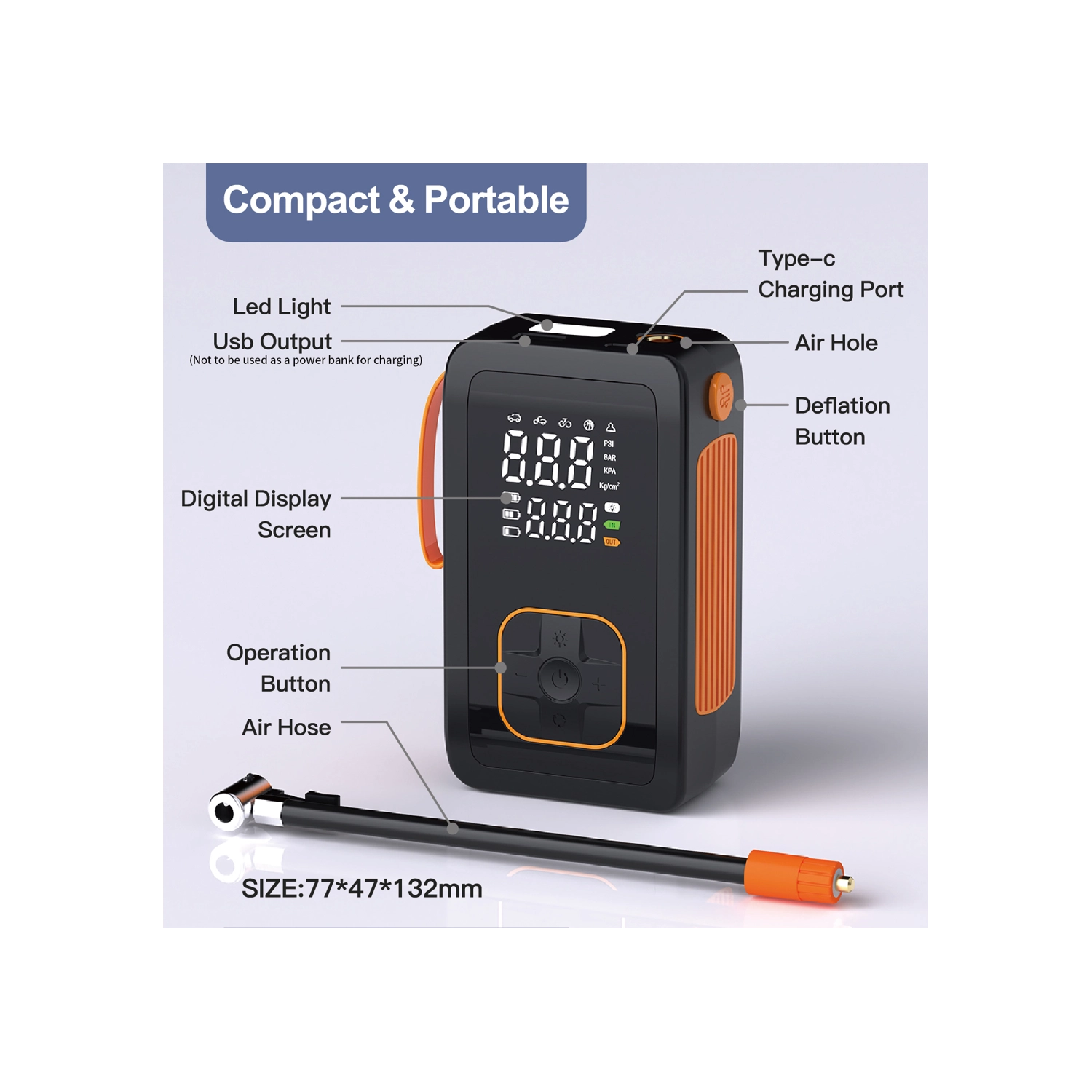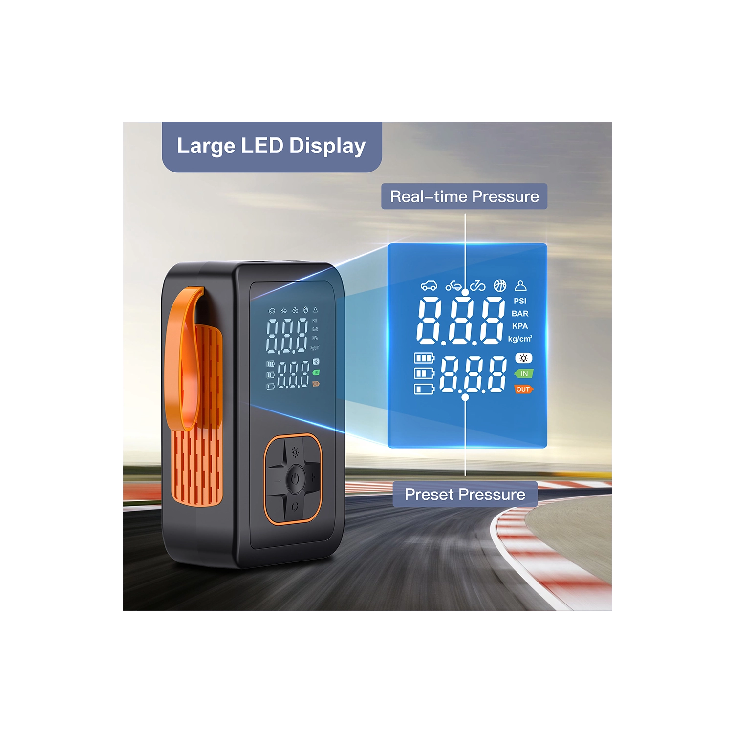 Denne bærbare 7,4 V batteripumpe kombinerer kraftig oppumpning op til 150 PSI / 10,3 BAR med en praktisk powerbank. Takket være de kompakte mål og det praktiske bærehåndtag er den ideel til rejser, bilen og værkstedet. Det dobbelt digitale display viser både indstillet og aktuelt tryk, mens automatisk slukning stopper pumpningen, når målet er nået.