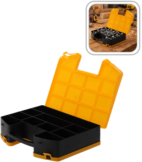 Hold orden i dine småting med en kompakt, dobbeltsidet organizer. Takket være den smarte inddeling og 28 rum har du altid alle smådele på deres plads og lige ved hånden. Et ideelt valg til gør‑det‑selv‑folk, håndværkere og husholdninger.
