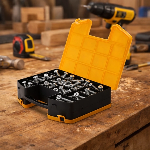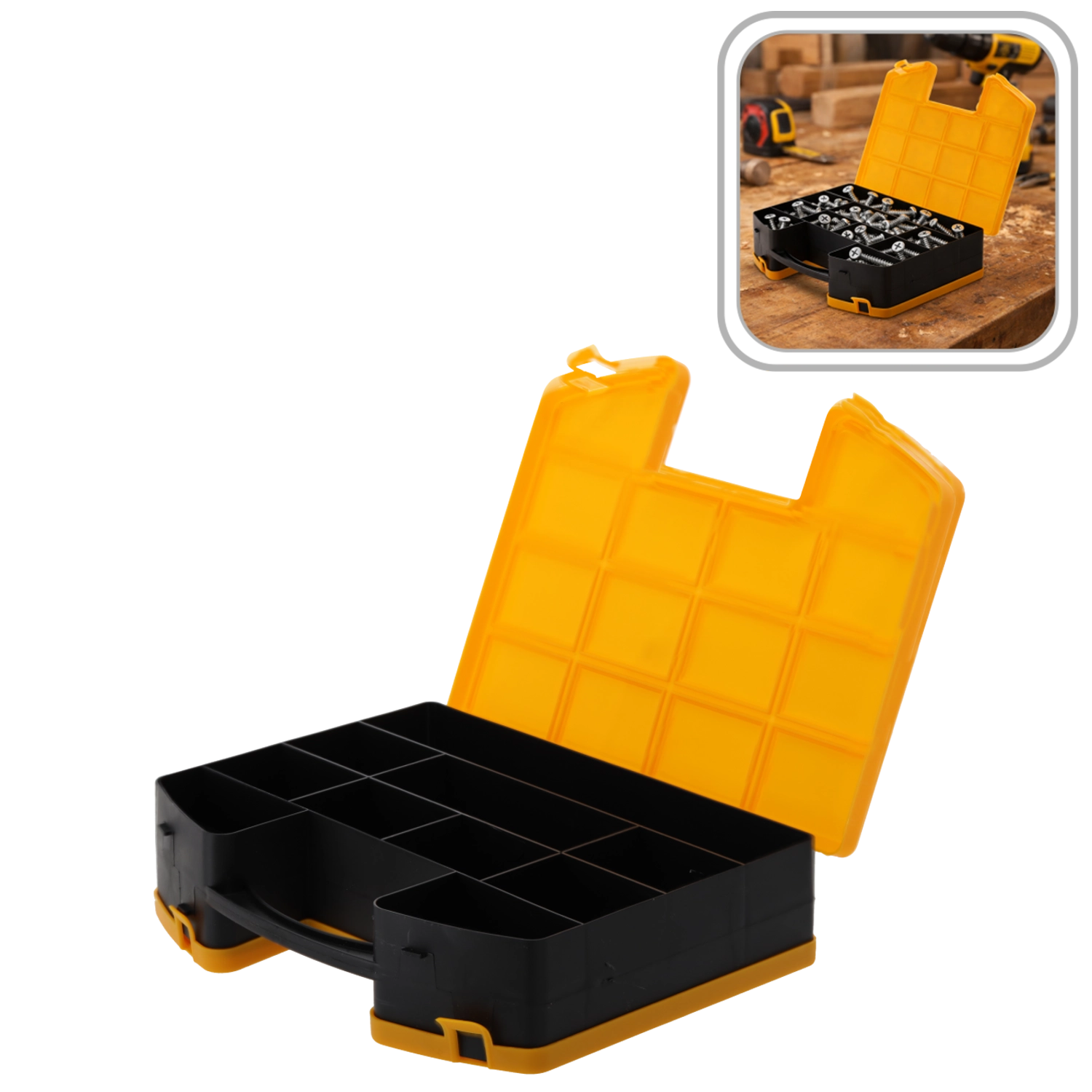 Praktisk dobbeltsidet organizer med kompakte mål 26,5 × 20 × 6 cm, som tilbyder i alt 28 rum til overskuelig opbevaring af skruer, søm, sytilbehør og andre småting. Takket være det dobbeltsidede design har du hurtig adgang til alt, mens den holdbare plast sikrer lang levetid i både hjemmeværksted og sykrog.