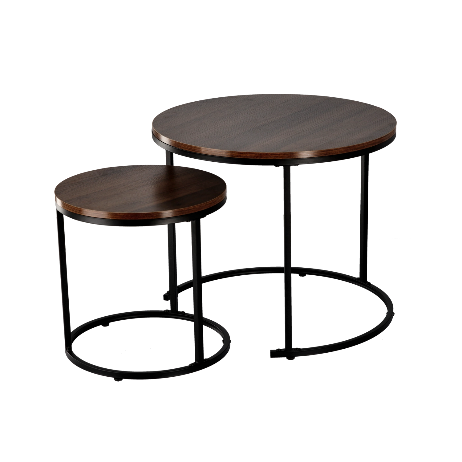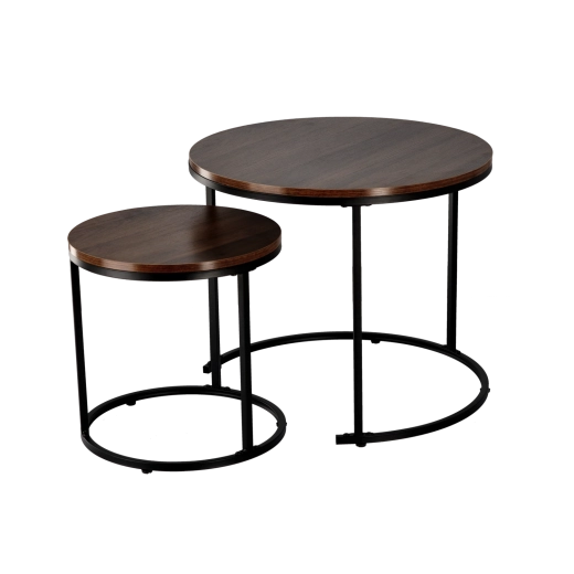 Sættet med to borde bringer fleksibilitet og stil til enhver stue. Det mindre bord kan delvist skubbes ind under det større, så du sparer plads og får nem adgang fra sofaen. Den stabile metalramme i sort og den letplejede bordplade med trædekor danner en tidløs kombination, der fremhæver din indretning.