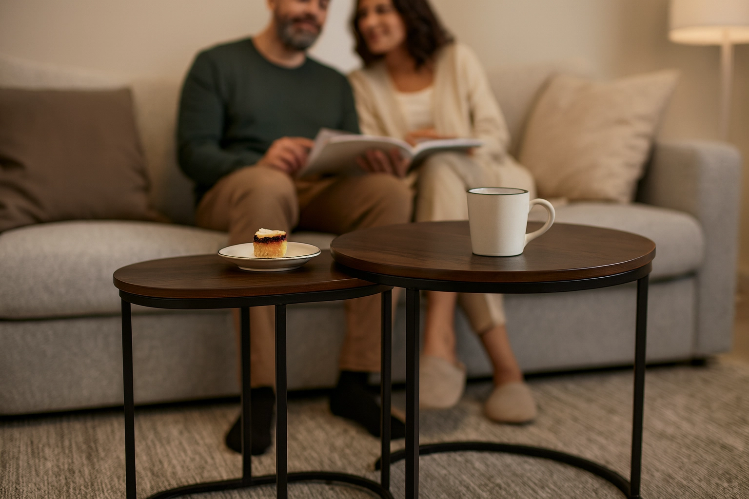 Dette alsidige sæt borde er et fremragende valg til den moderne stue, en hyggelig læsekrog eller mindre boliger. Kombinationen af trædekor og sort metalkonstruktion giver et tidløst udtryk, der passer til både industriel, skandinavisk og klassisk stil.